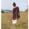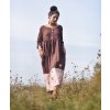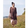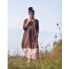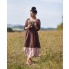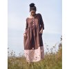 Maxišaty z kvalitního, jemného, českého lnu v kombinaci hnědé a pudrově růžové barvy - volnější střih, nad pasem nabírané, horní díl propínací na knoflíčky z přírodní perleti, dlouhé rukávy, vnitřní kapsy v bočním švu, délka nad kotníky.