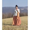 Luxusní maxi sukně z českého, jemného, splývavého lnu cihlové barvy. Sukně je široká, v pase / sníženém pase dvě řady gumiček v tunýlku a asymetricky na straně tkanička ze stejného materiálu na stažení. Kapsy ve švech.