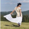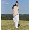 Dlouhé turky ušité z krásného jemného lnu české výroby. Vnitřní kapsy, dvojitě prošité švy, vepředu i vzadu ozdobný prošitý svislý šev, v pase pružný černý lem bavlna / elastan.