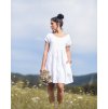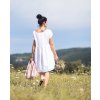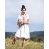 Šaty z českého lnu v bílé barvě. Větší výstřih, volnější střih, nad pasem nabírané, délka nad kolena, přinechané rukávky, vnitřní kapsy v bočním švu.