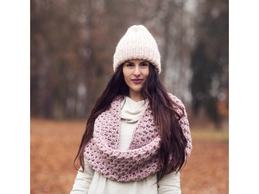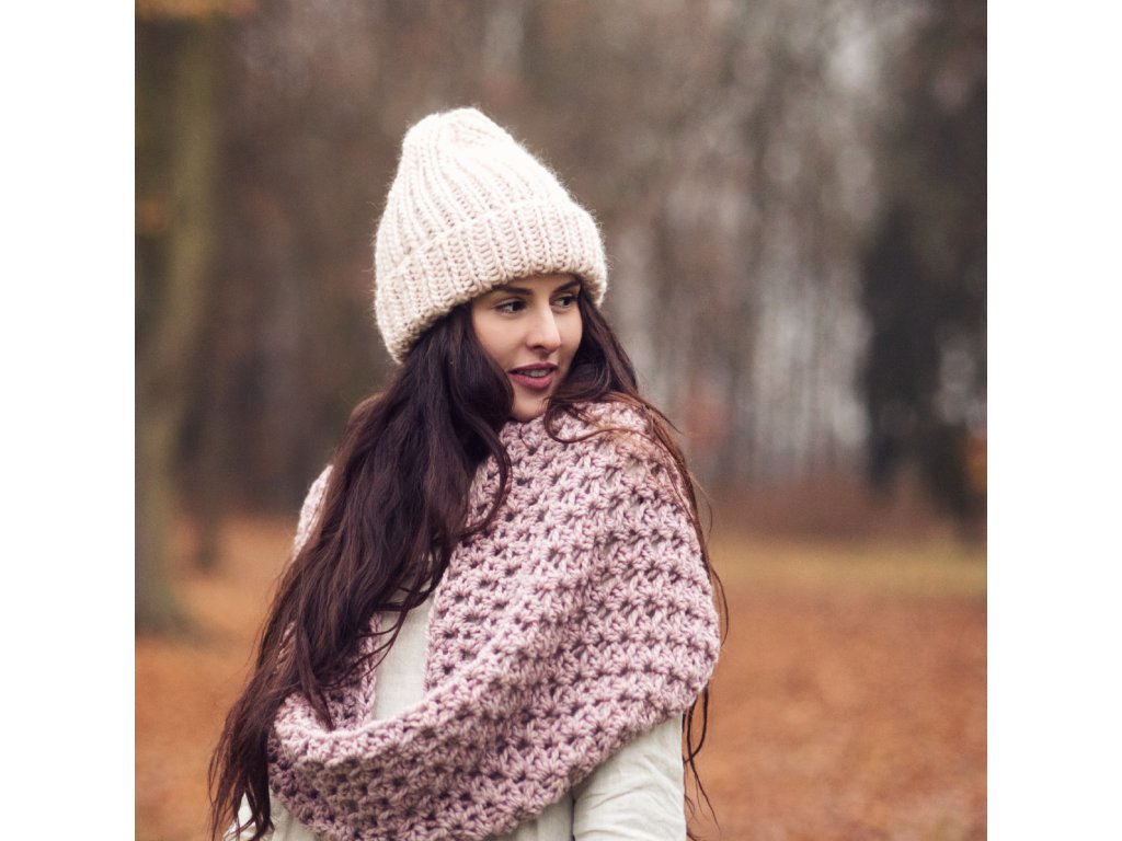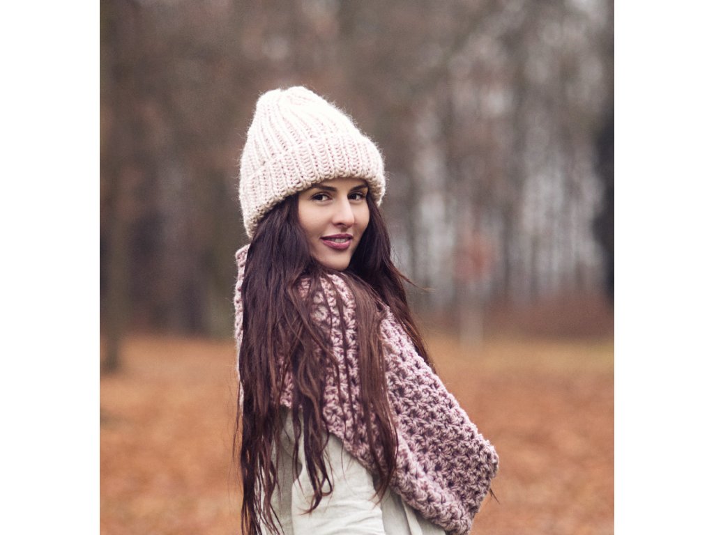 Ručně pletená objemná čepice z jemné vlněné příze v odstínu Marshmallow.