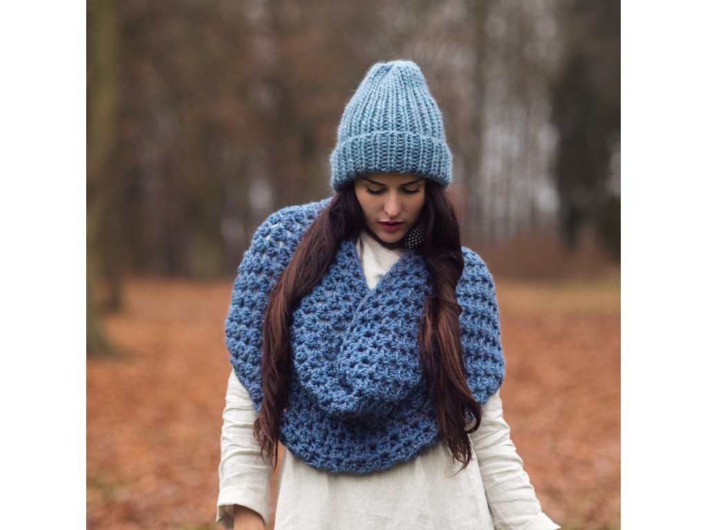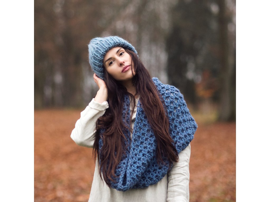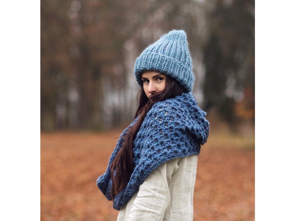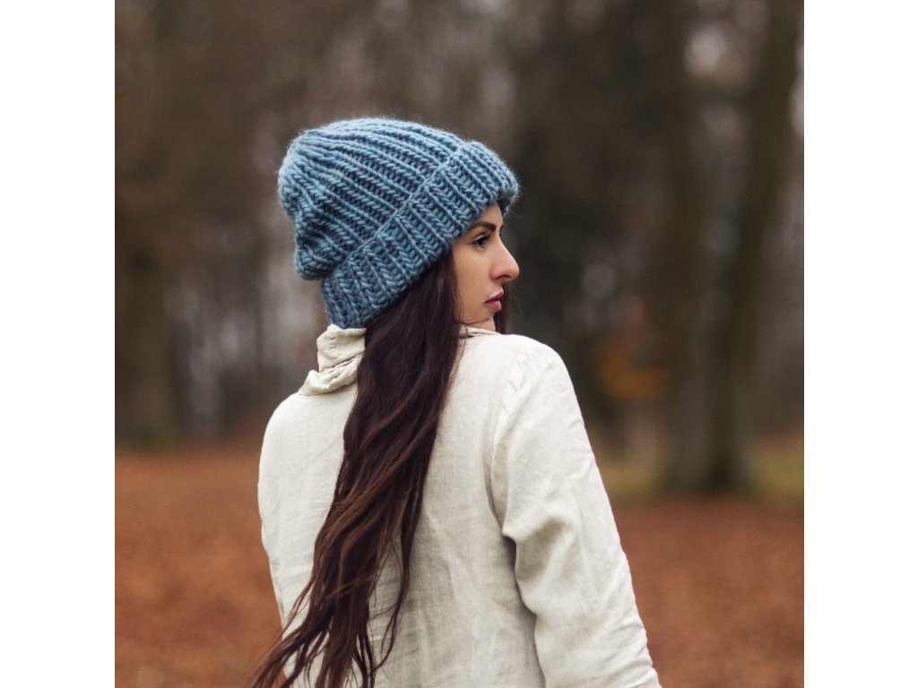 Ručně pletená objemná čepice z jemné vlněné příze v odstínu Mlžné modři.