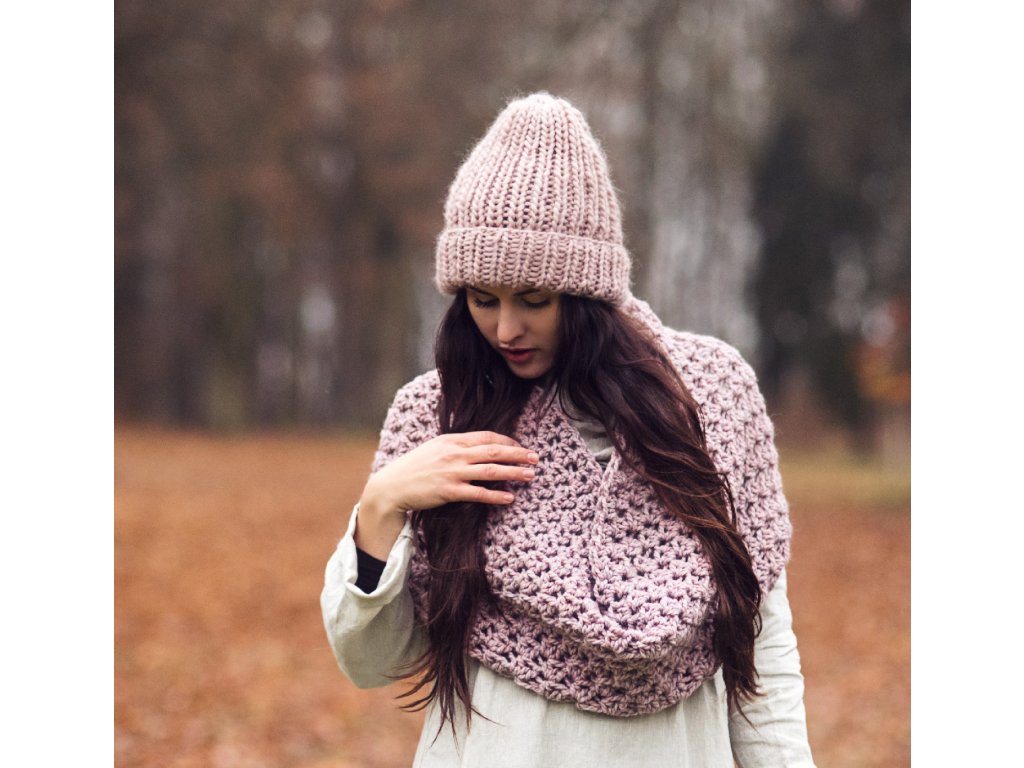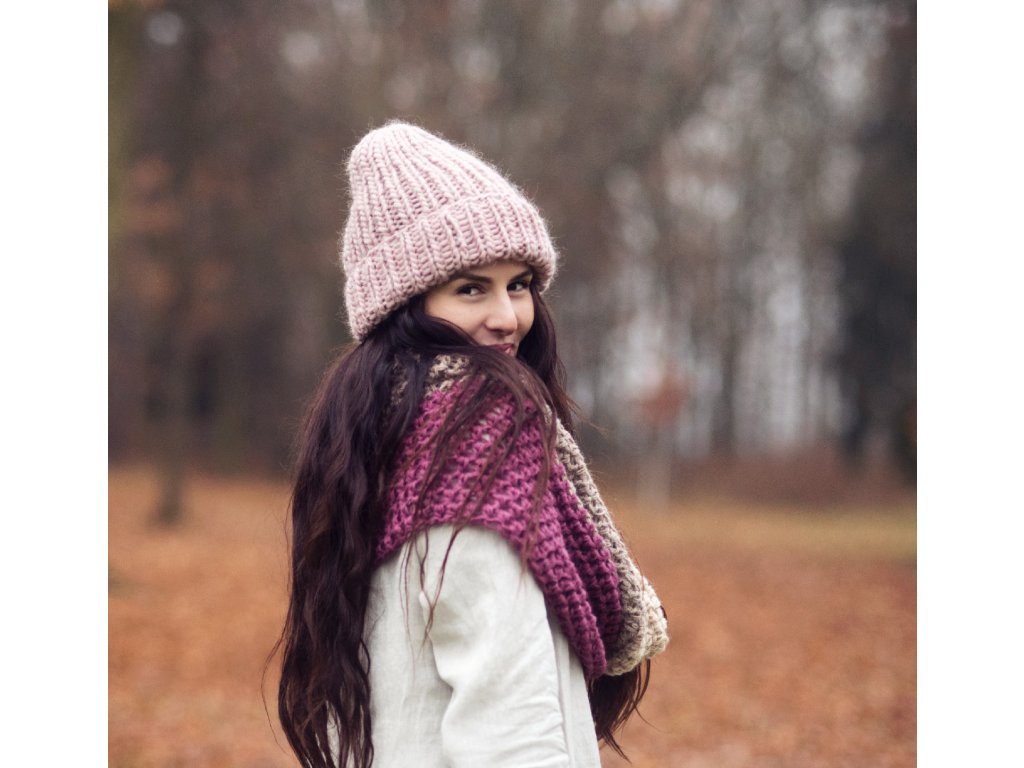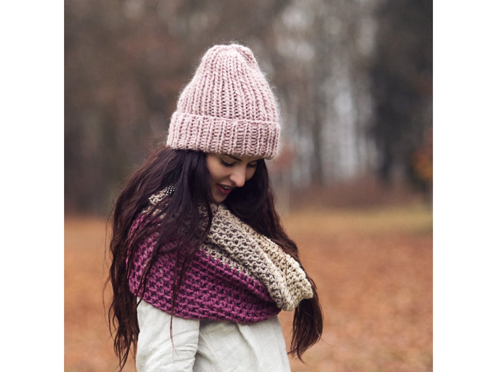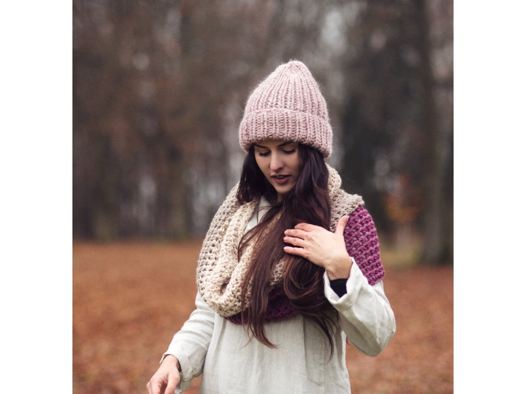 Ručně pletená objemná čepice z jemné vlněné příze v pudrově hnědém odstínu.