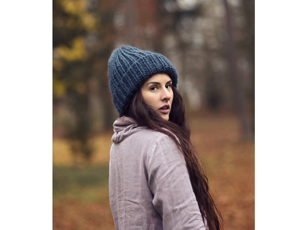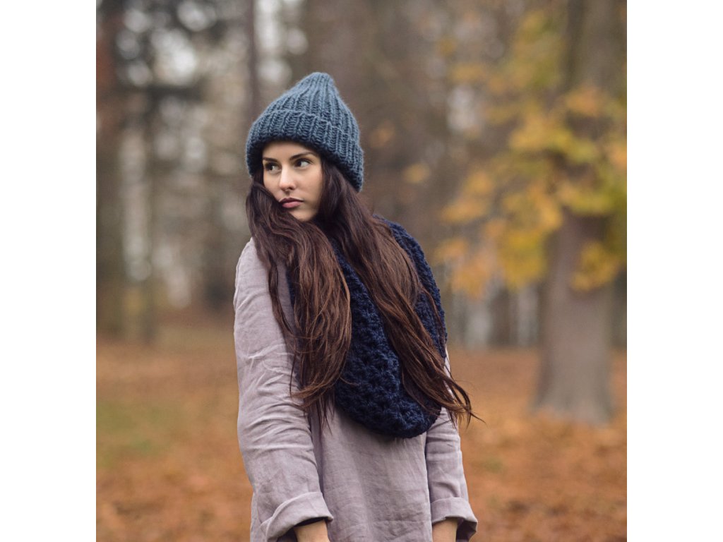 Ručně pletená objemná čepice z jemné vlněné příze v odstínu Půlnočné modři.