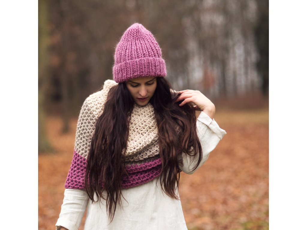 Ručně pletená objemná čepice z jemné vlněné příze v odstínu vřesu.