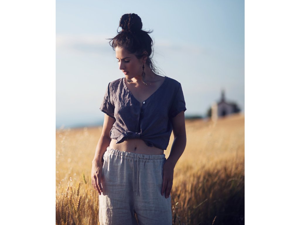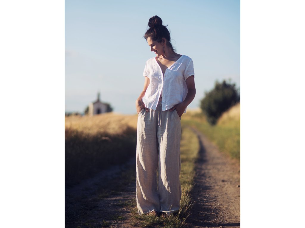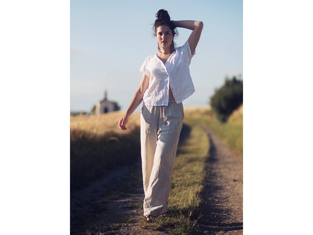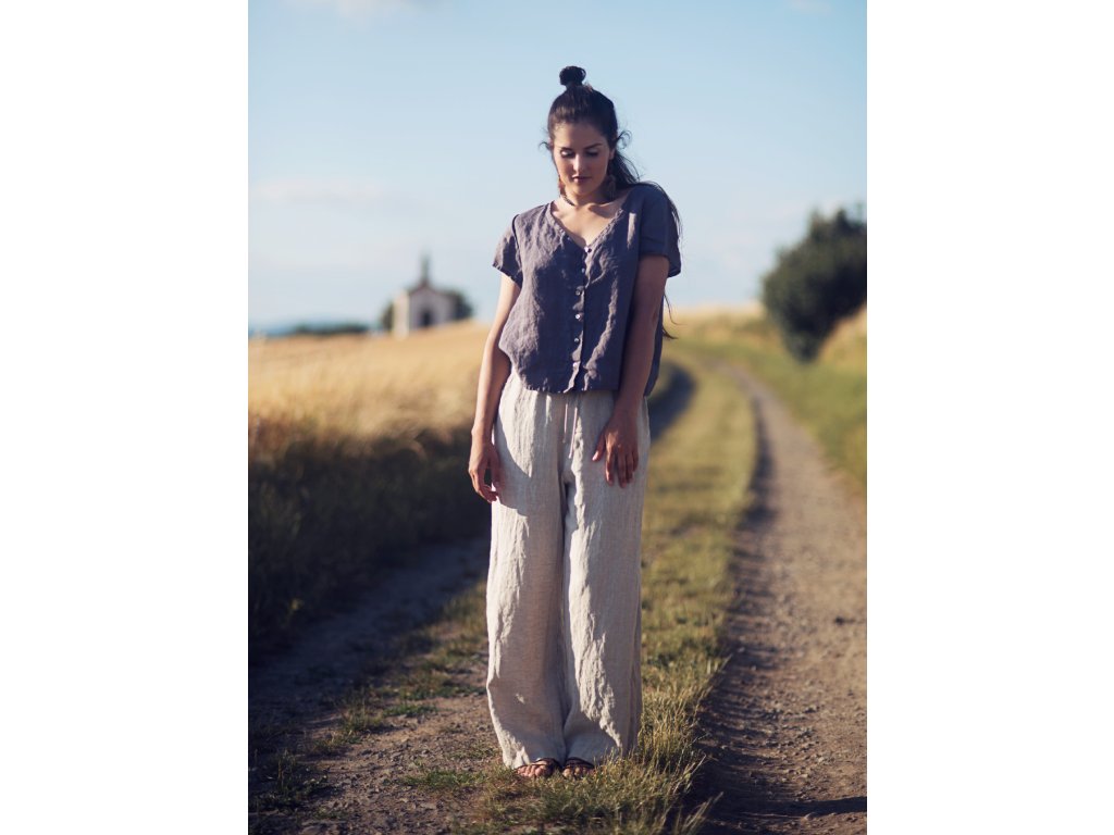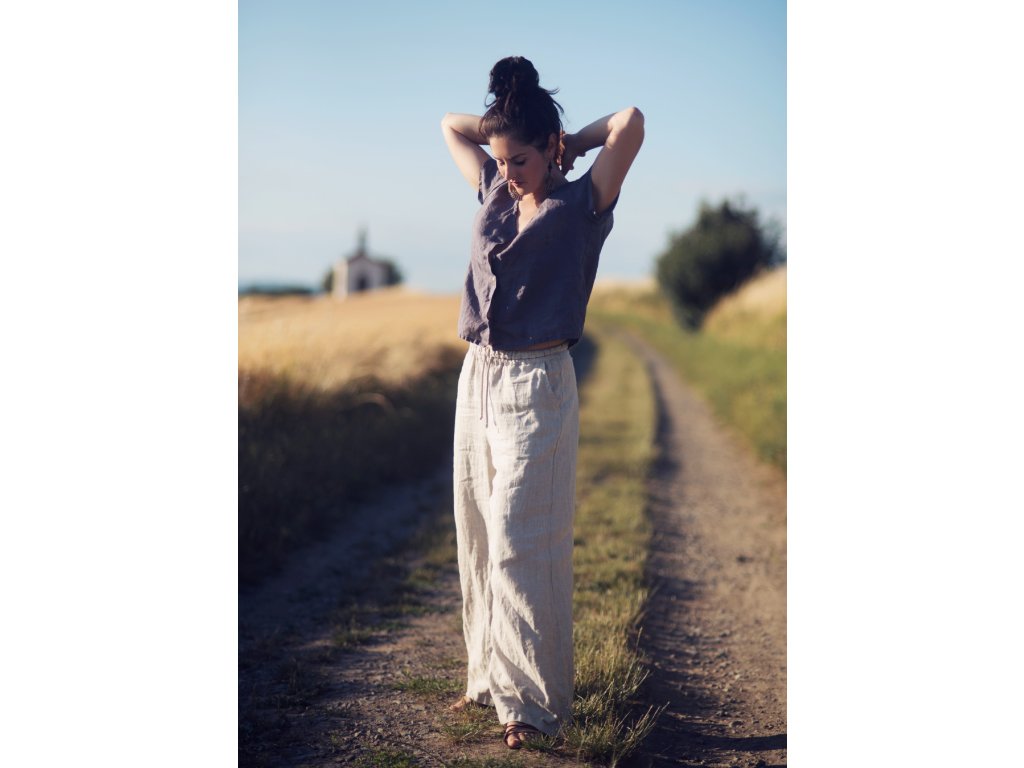 Dlouhé kalhoty ušité z měkkého, jemného lnu české výroby. Ve sníženém pase do gumy, široké nohavice, velké kapsy, slušivý střih.