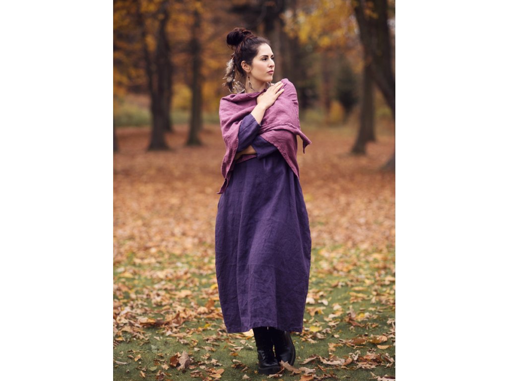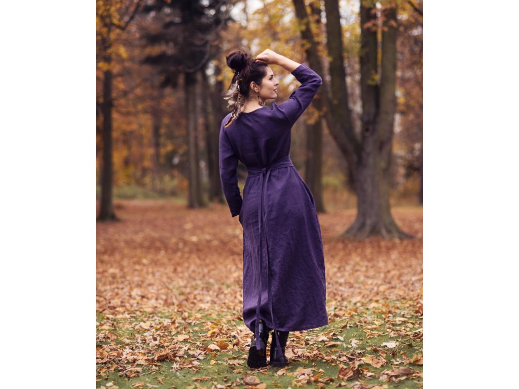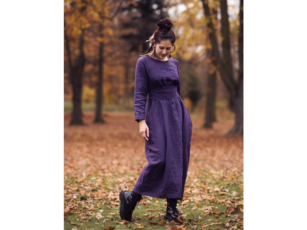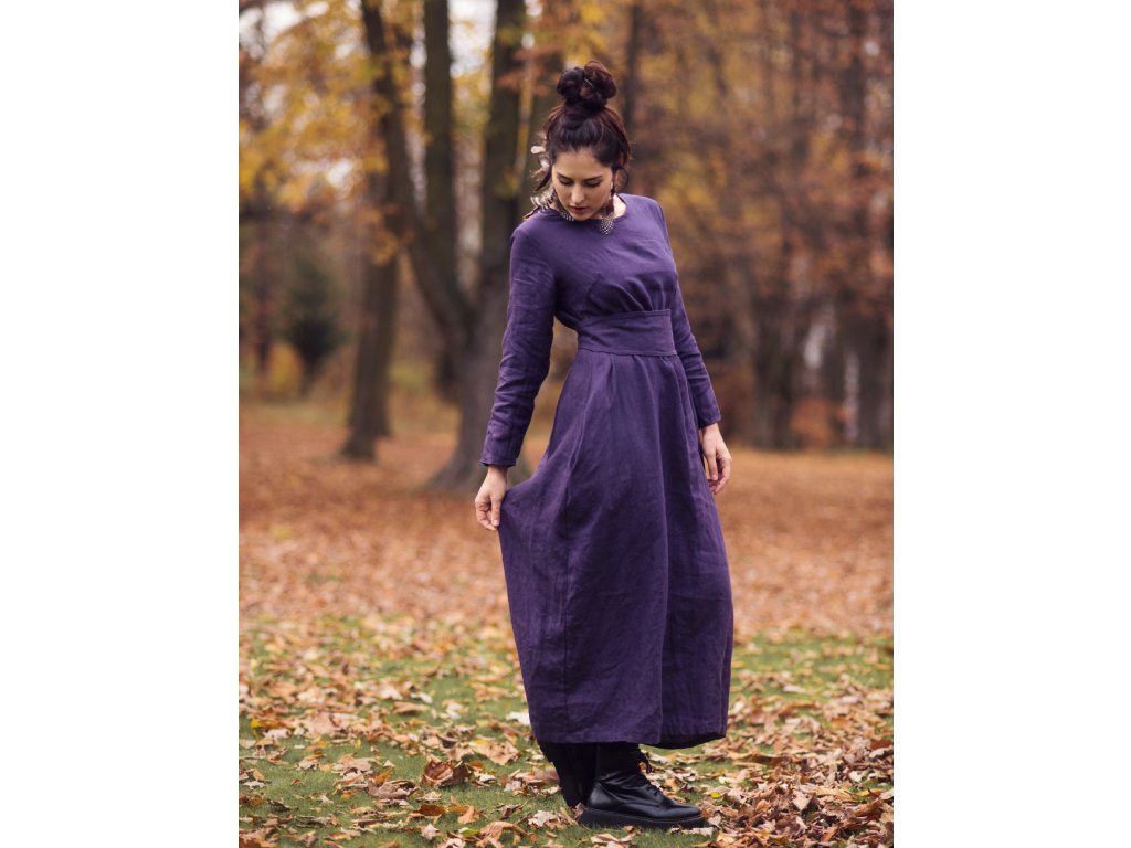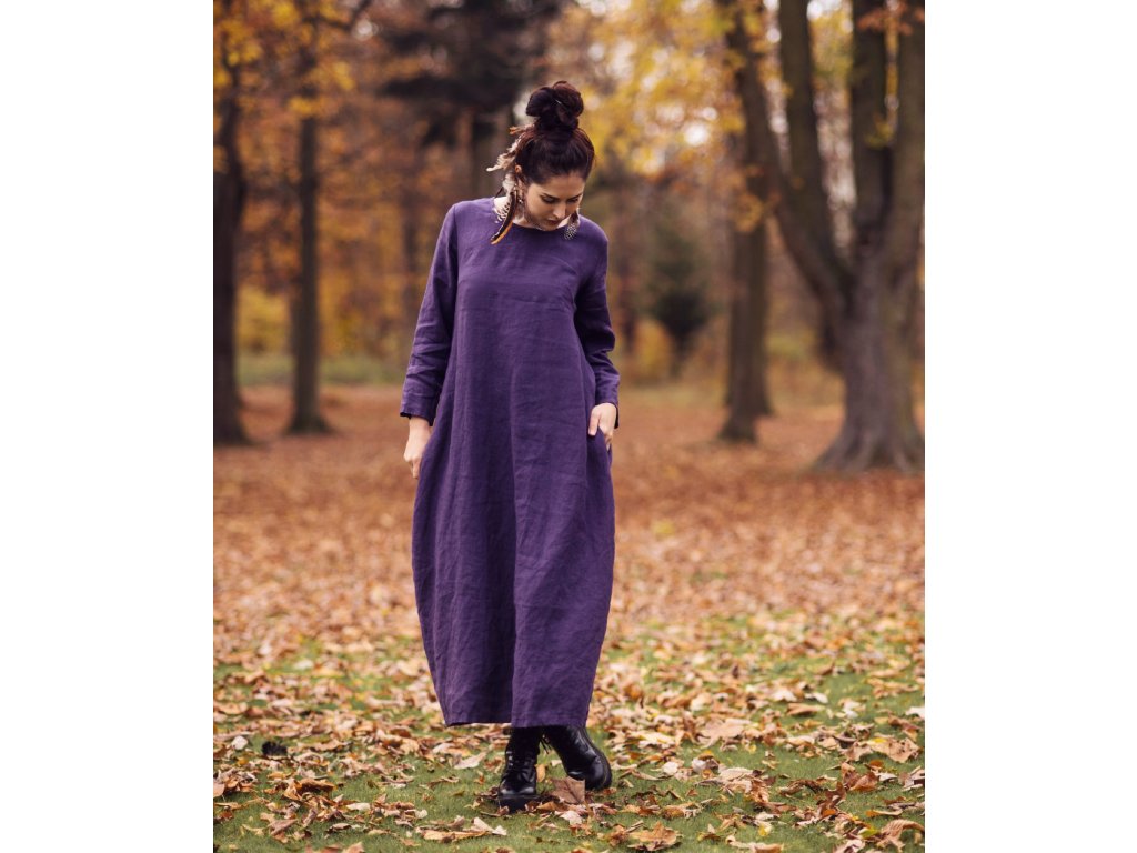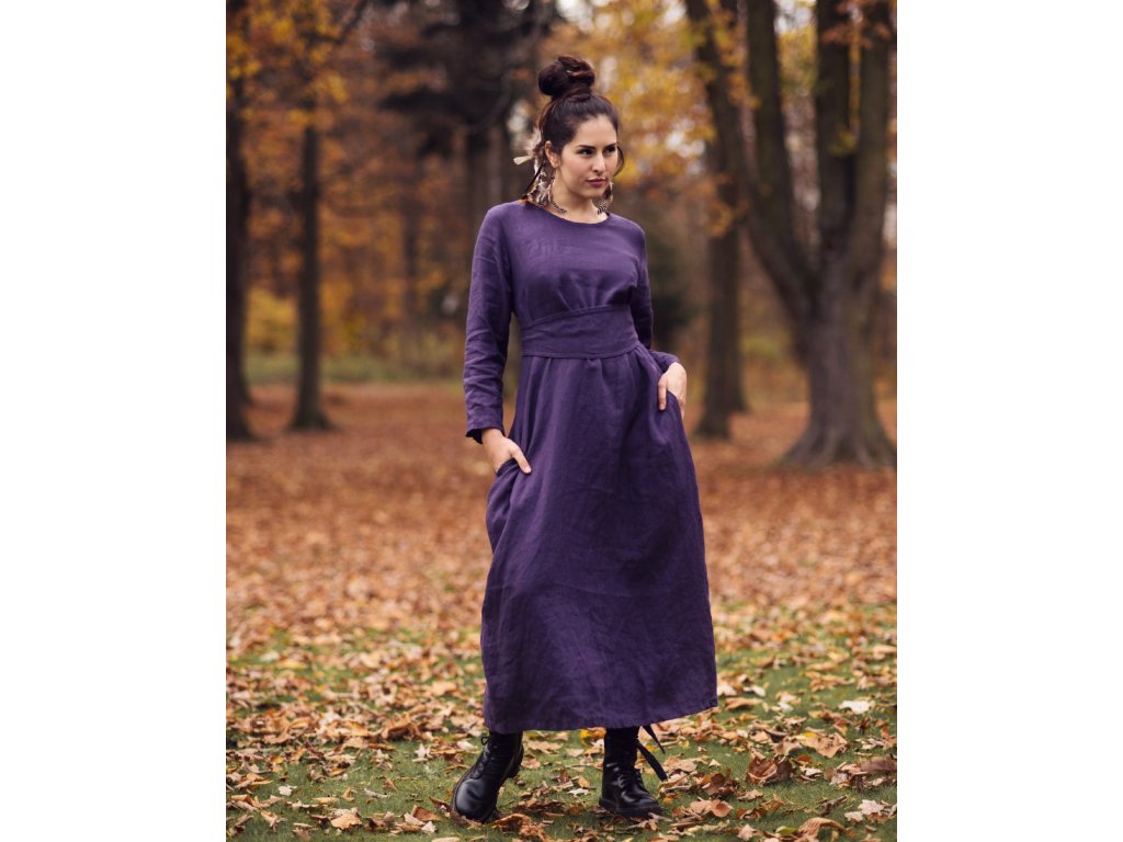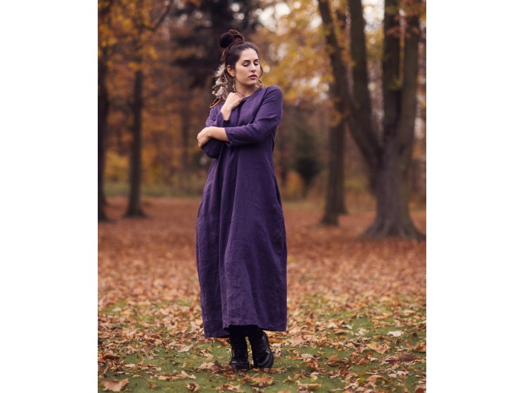 Maxi šaty z kvalitního jemného českého lnu ve švestkově fialovém odstínu. Pohodlný, slušivý střih s prsními záševky, hladké, dlouhé rukávy, vnitřní kapsy v bočních švech.