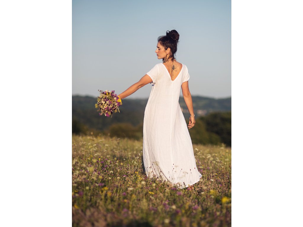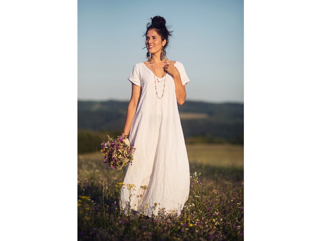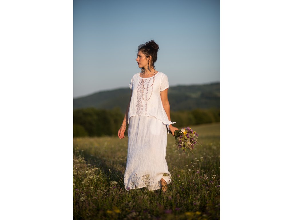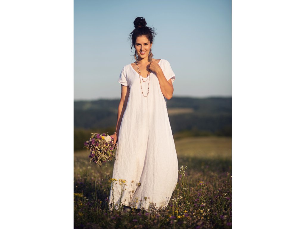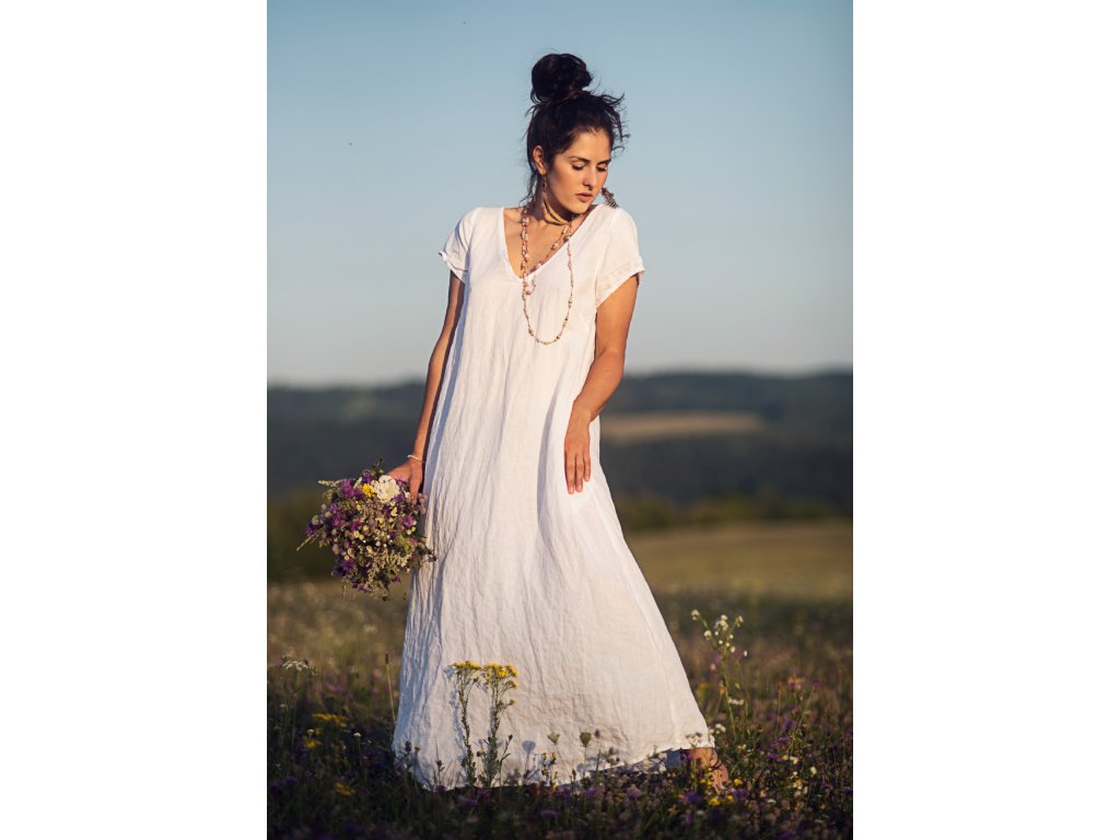 Maxišaty z kvalitního, jemného, českého lnu bílé barvy - hladký, volný, áčkový střih, vepředu i vzadu hlubší véčkový výstřih, krátké rukávy, vnitřní kapsy v bočním švu.