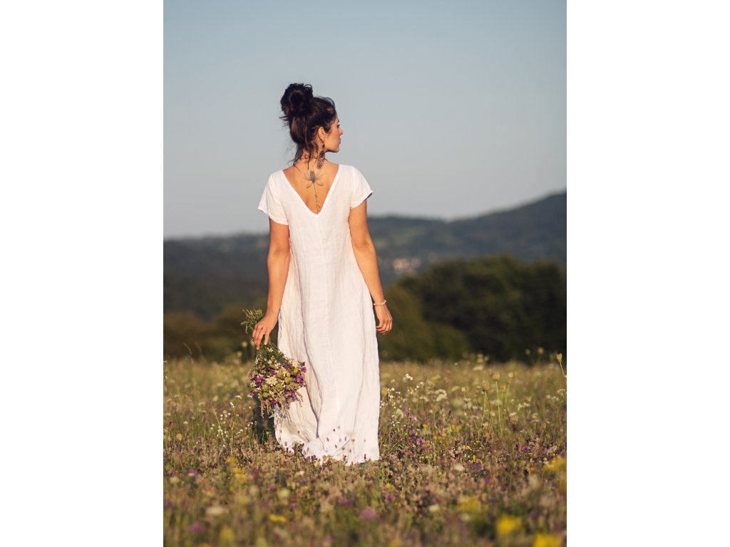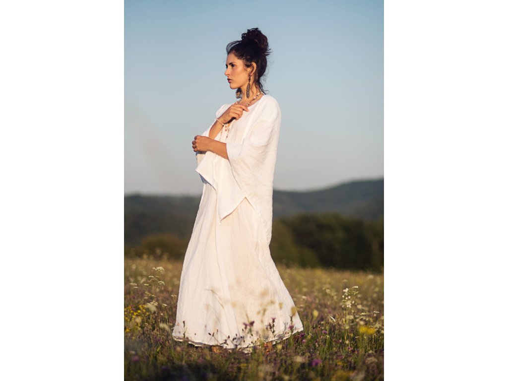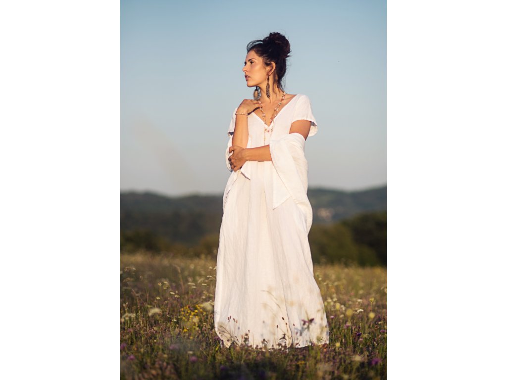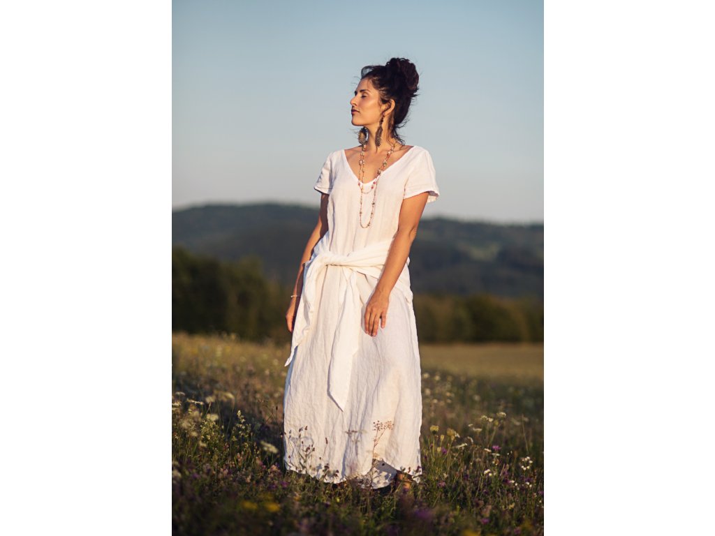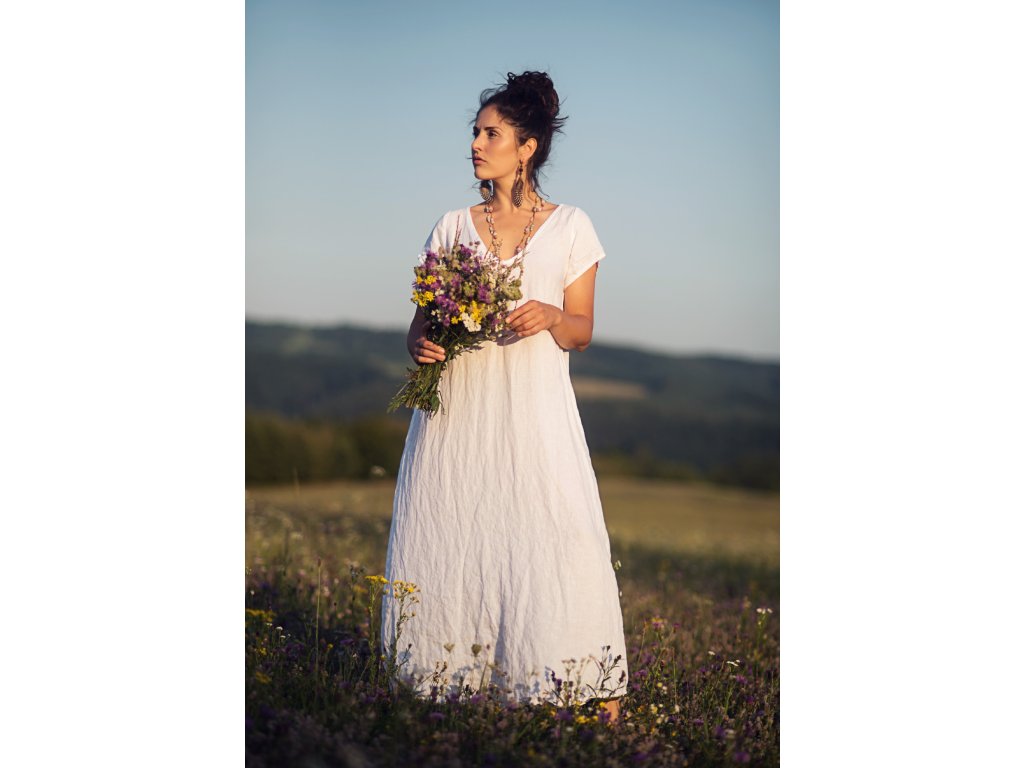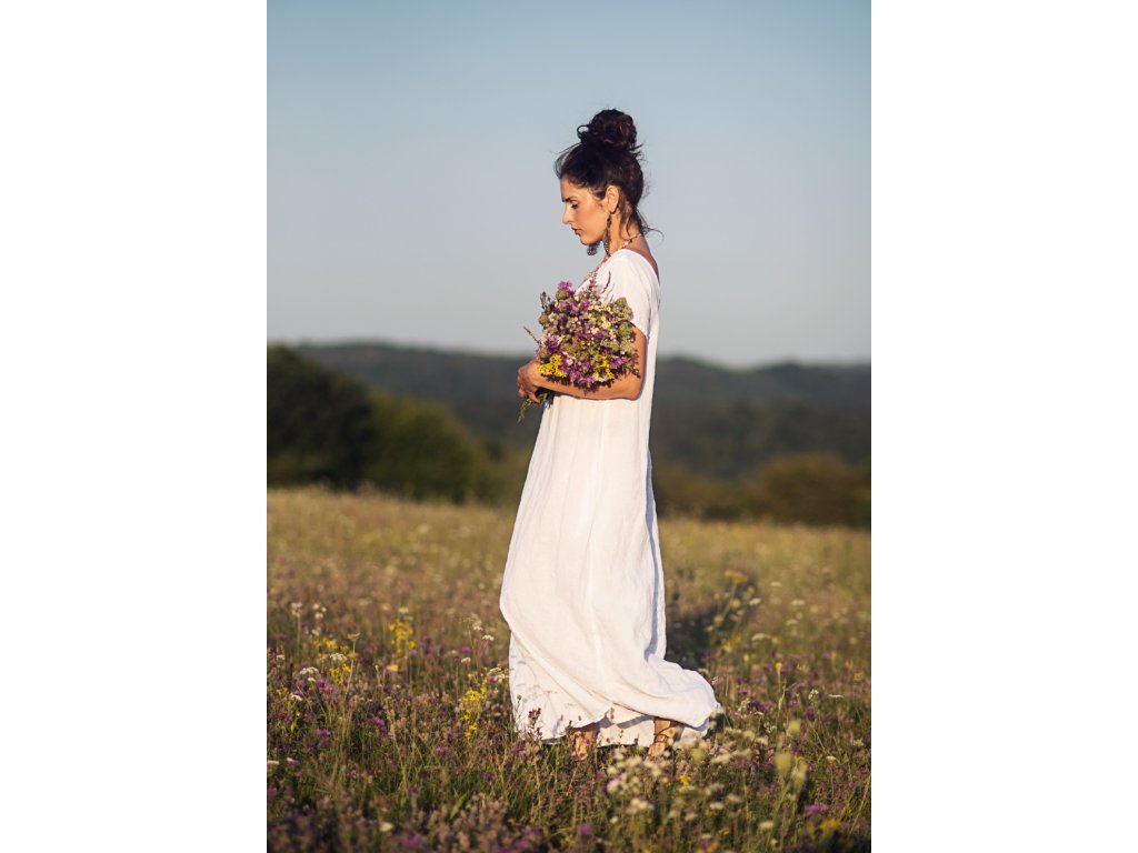 Maxišaty z kvalitního, jemného, českého lnu bílé barvy - hladký, volný, áčkový střih, vepředu i vzadu hlubší véčkový výstřih, krátké rukávy, vnitřní kapsy v bočním švu.