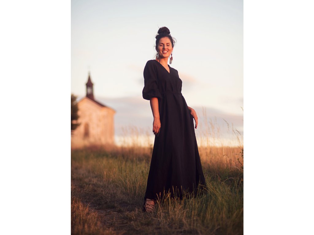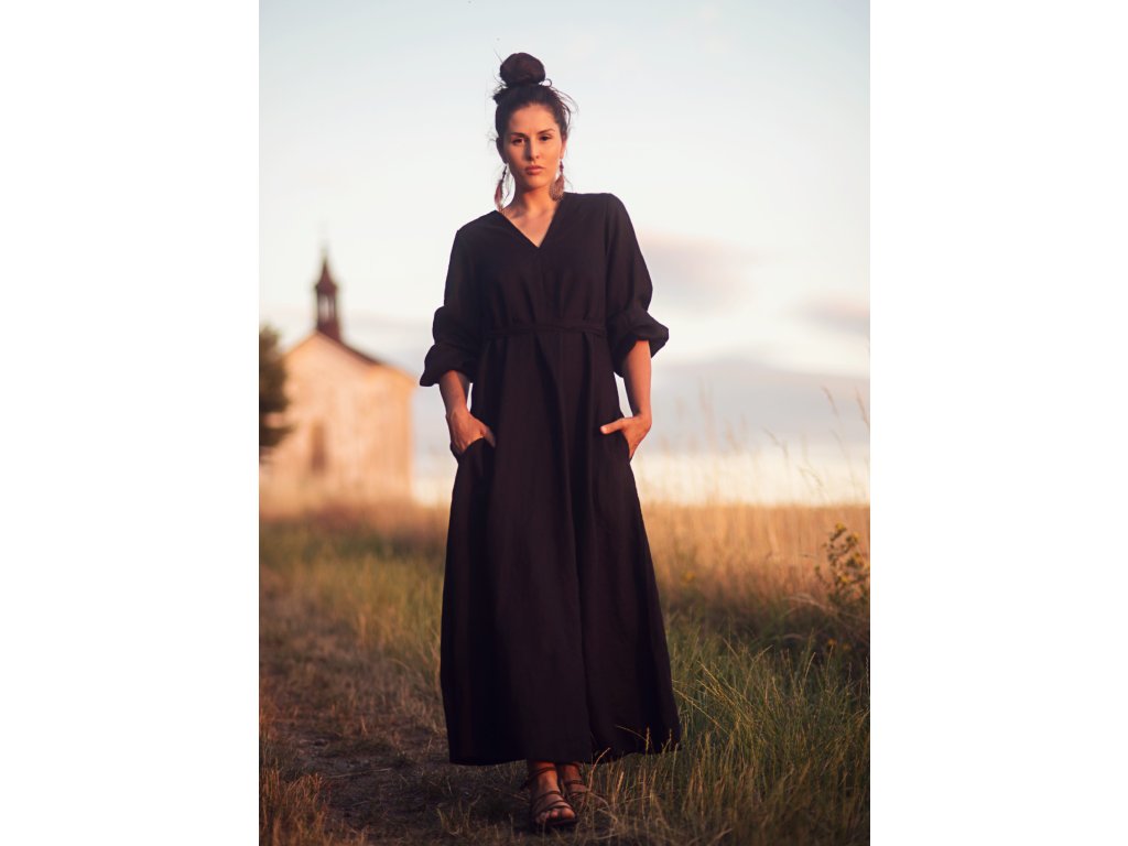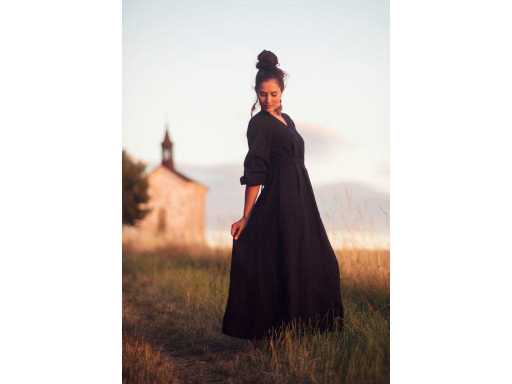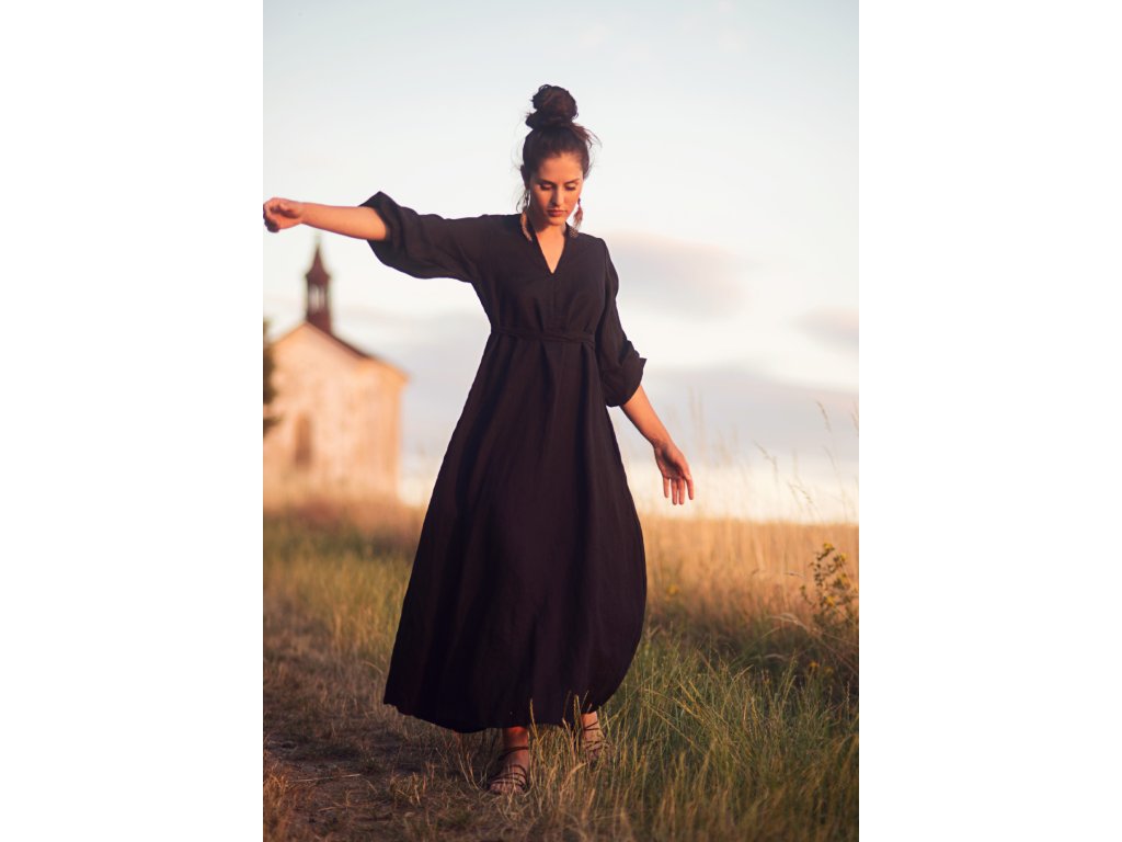 Maxišaty z kvalitního, jemného, českého lnu černé barvy - v bocích všité šňůrky na volné zavázání nebo stažení, výstřih do V vepředu i vzadu, dlouhé, dole nabrané rukávy.