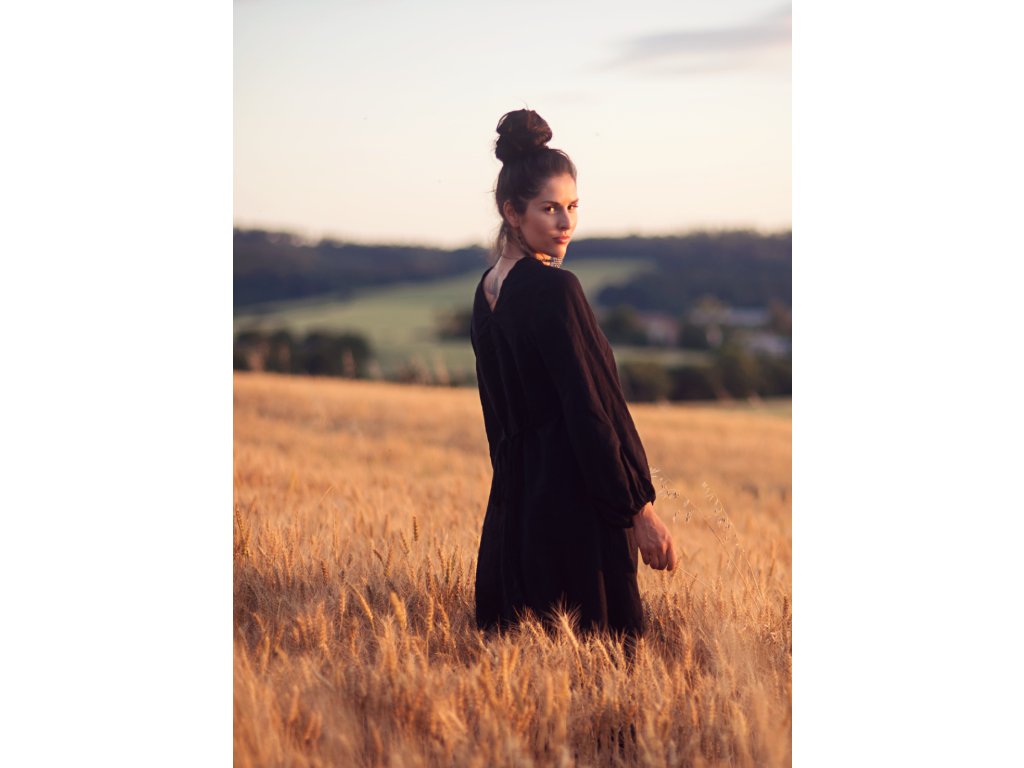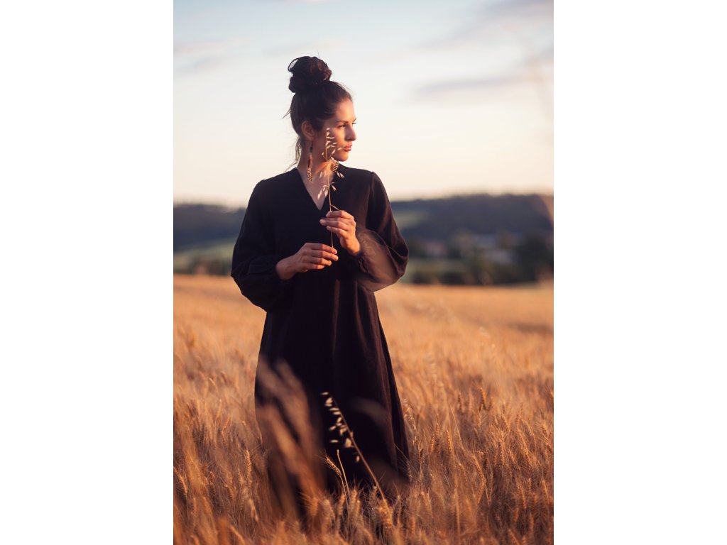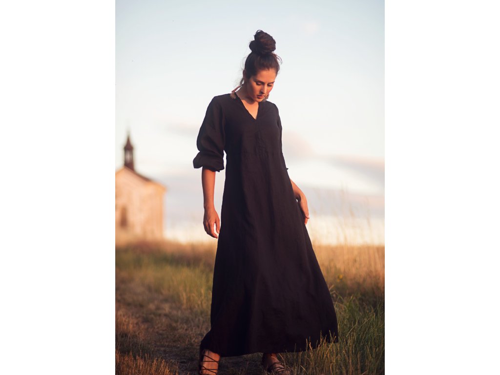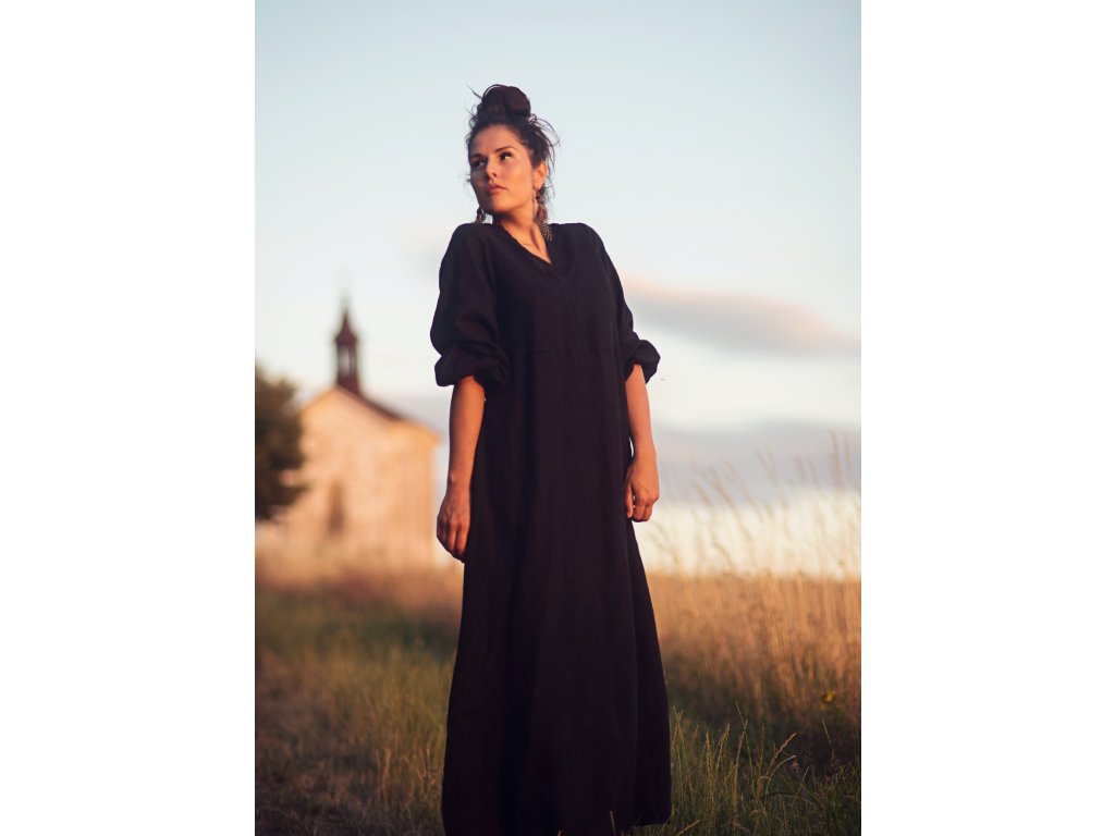Maxišaty z kvalitního, jemného, českého lnu černé barvy - v bocích všité šňůrky na volné zavázání nebo stažení, výstřih do V vepředu i vzadu, dlouhé, dole nabrané rukávy.