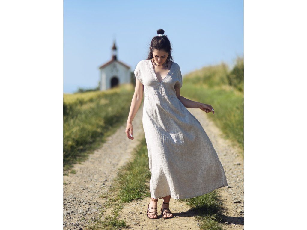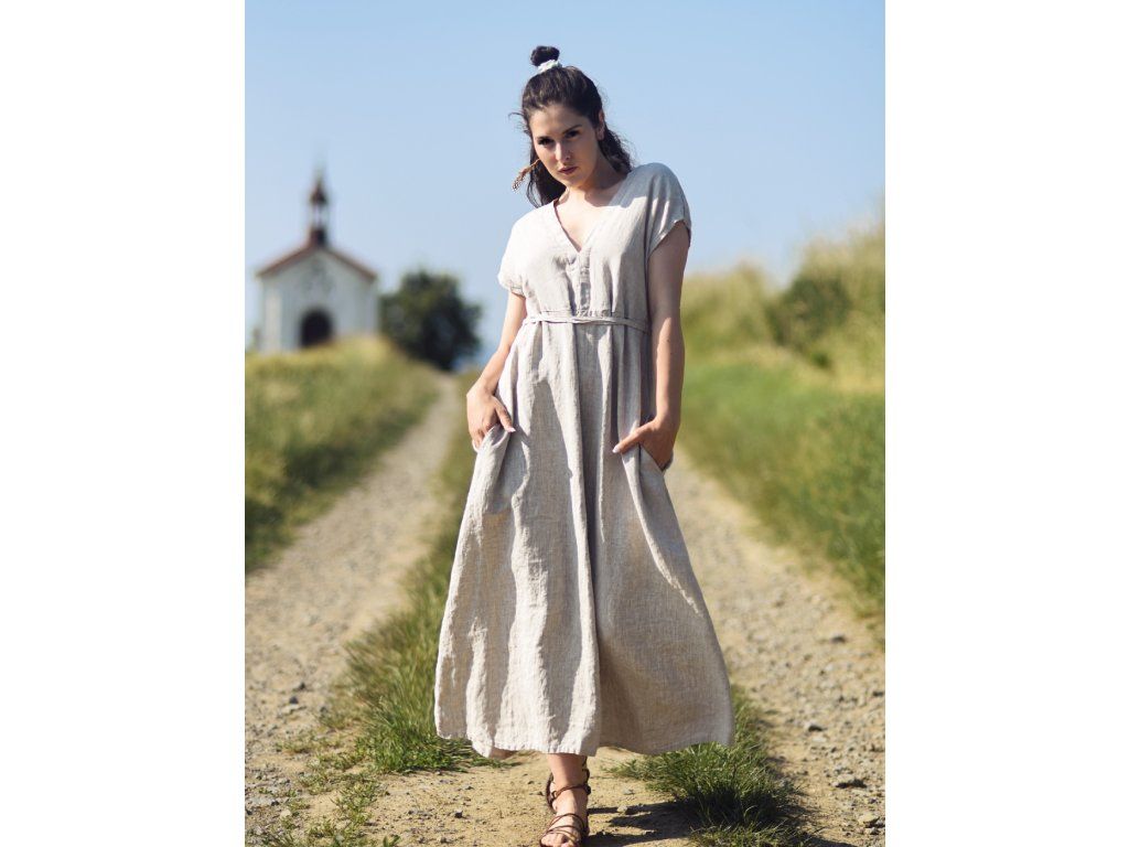 Maxišaty z kvalitního, jemného, českého lnu režné barvy - možnost nosit několika způsoby.. v bocích všité šňůrky na volné zavázání nebo stažení, dají se nosit hlubším výstřihem jak v předu tak vzadu, vnitřní kapsy v bočním švu.