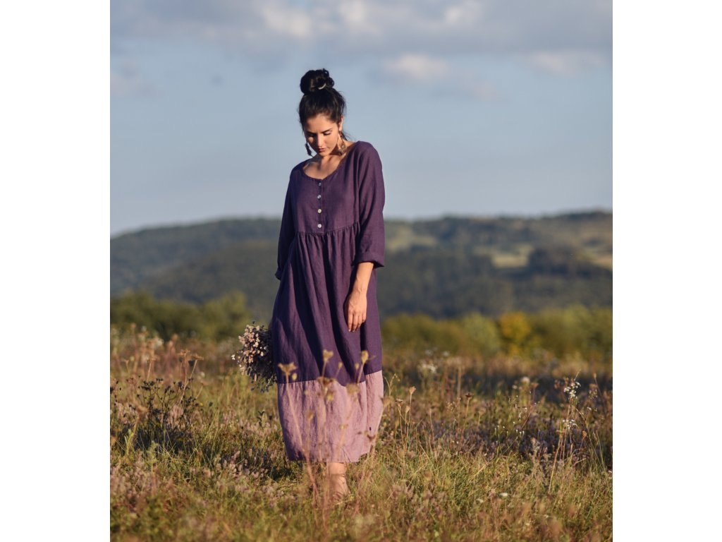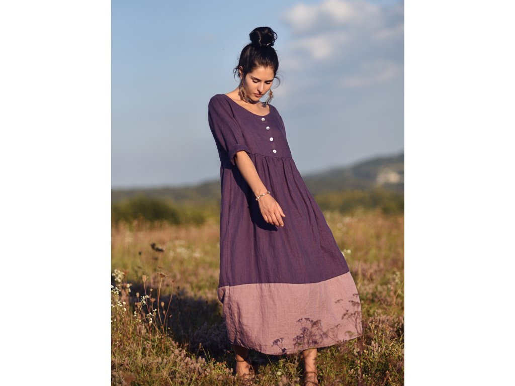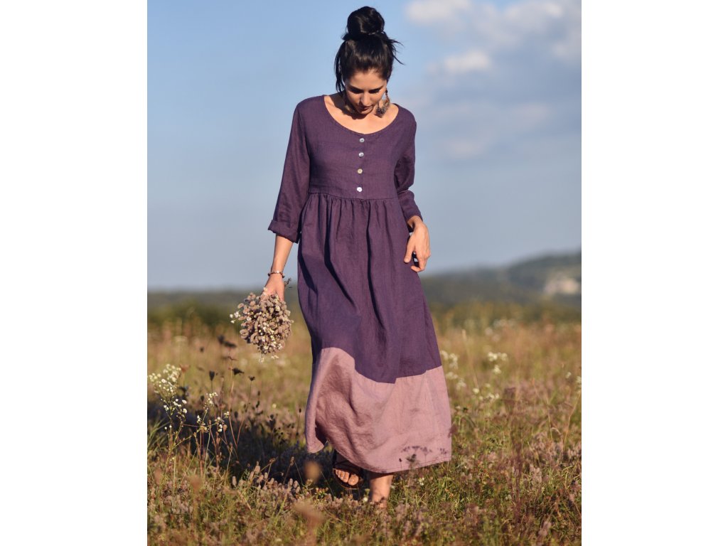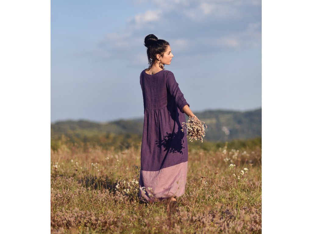 Maxišaty z kvalitního, jemného, českého lnu v kombinaci švestkové a mauve barvy - volnější střih, nad pasem nabírané, horní díl propínací na knoflíčky z přírodní perleti, dlouhé rukávy, vnitřní kapsy v bočním švu, délka nad kotníky.