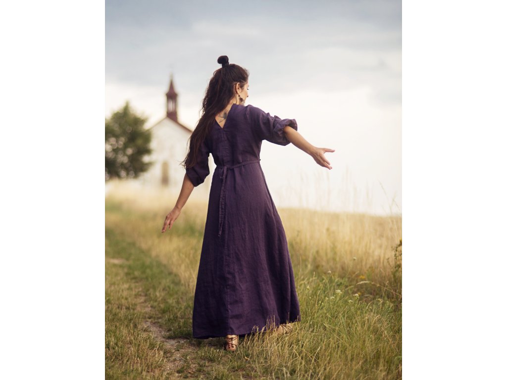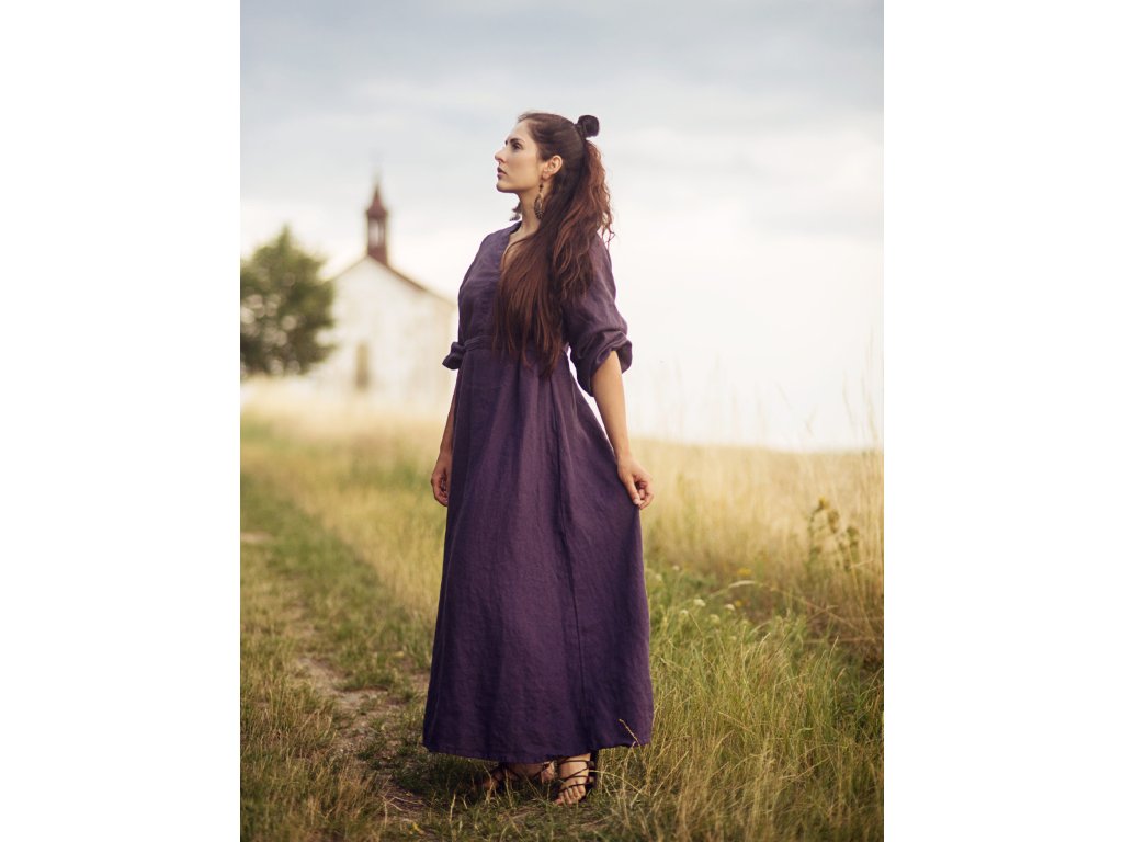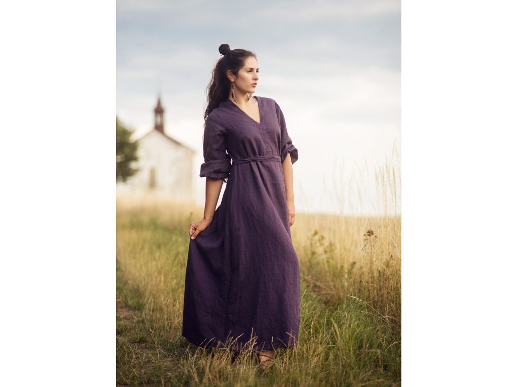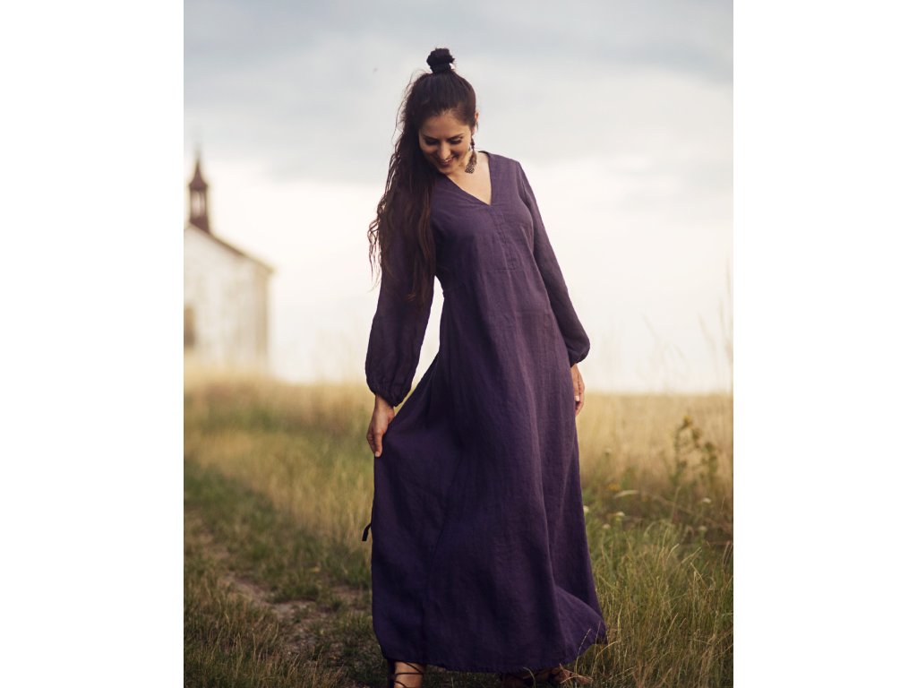 Maxišaty z kvalitního, jemného, českého lnu barvy švestkové - v bocích všité šňůrky na volné zavázání nebo stažení, výstřih do V vepředu i vzadu, dlouhé, dole nabrané rukávy.