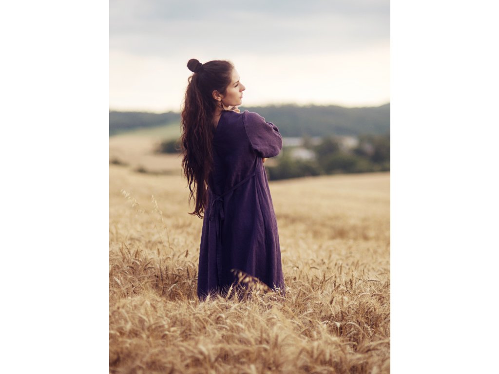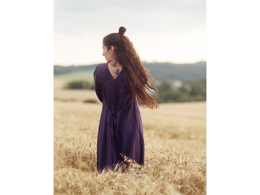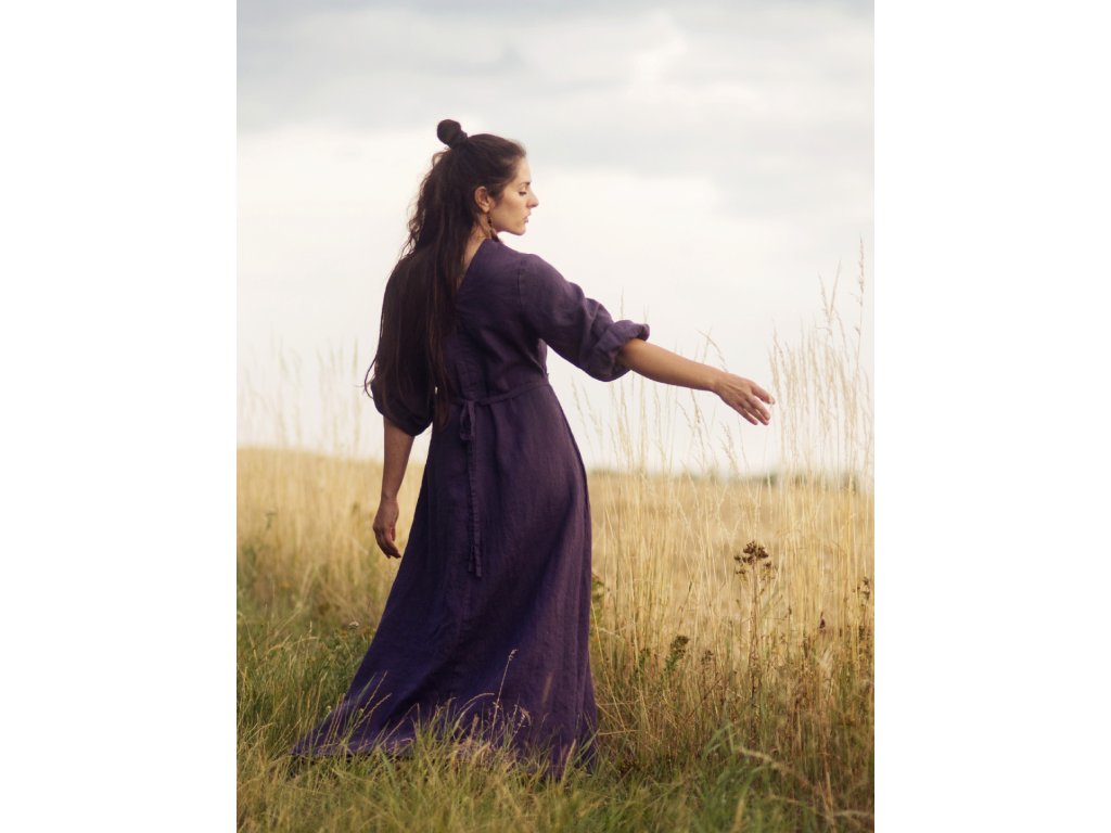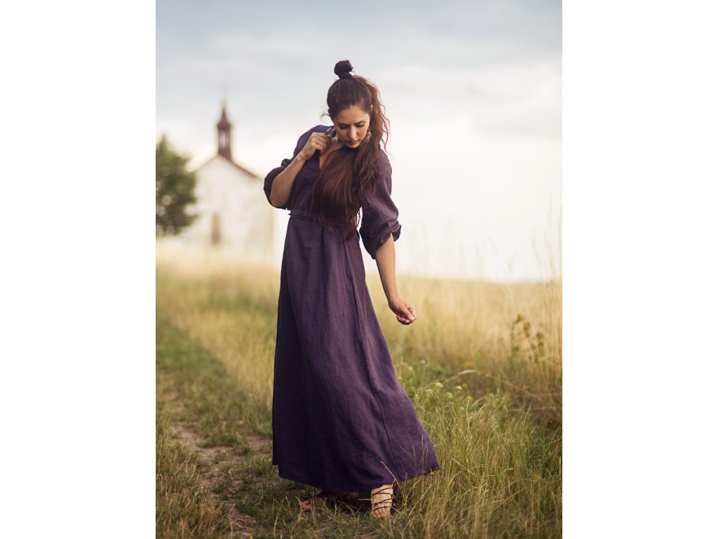 Maxišaty z kvalitního, jemného, českého lnu barvy švestkové - v bocích všité šňůrky na volné zavázání nebo stažení, výstřih do V vepředu i vzadu, dlouhé, dole nabrané rukávy.