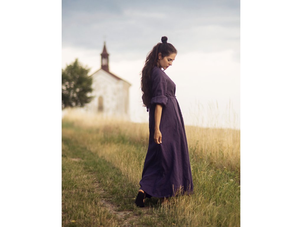 Lněné maxišaty Švestkové s vázáním