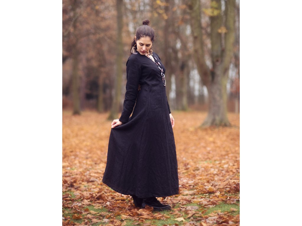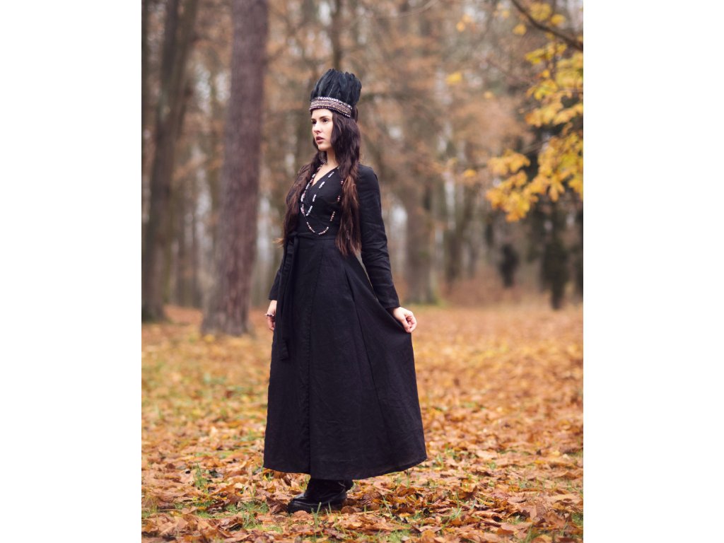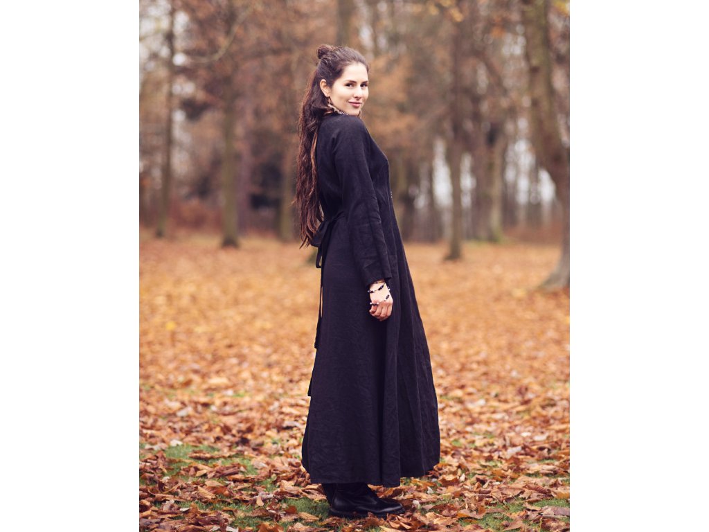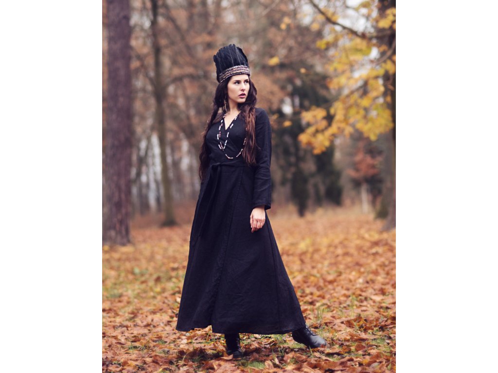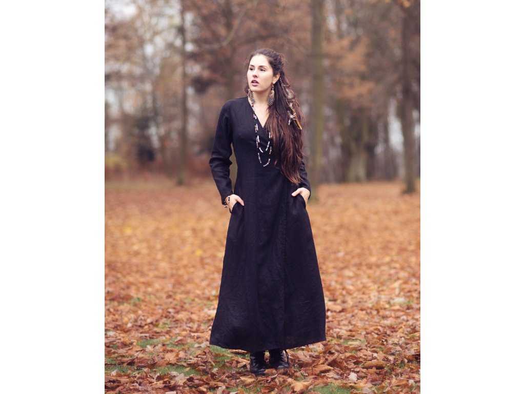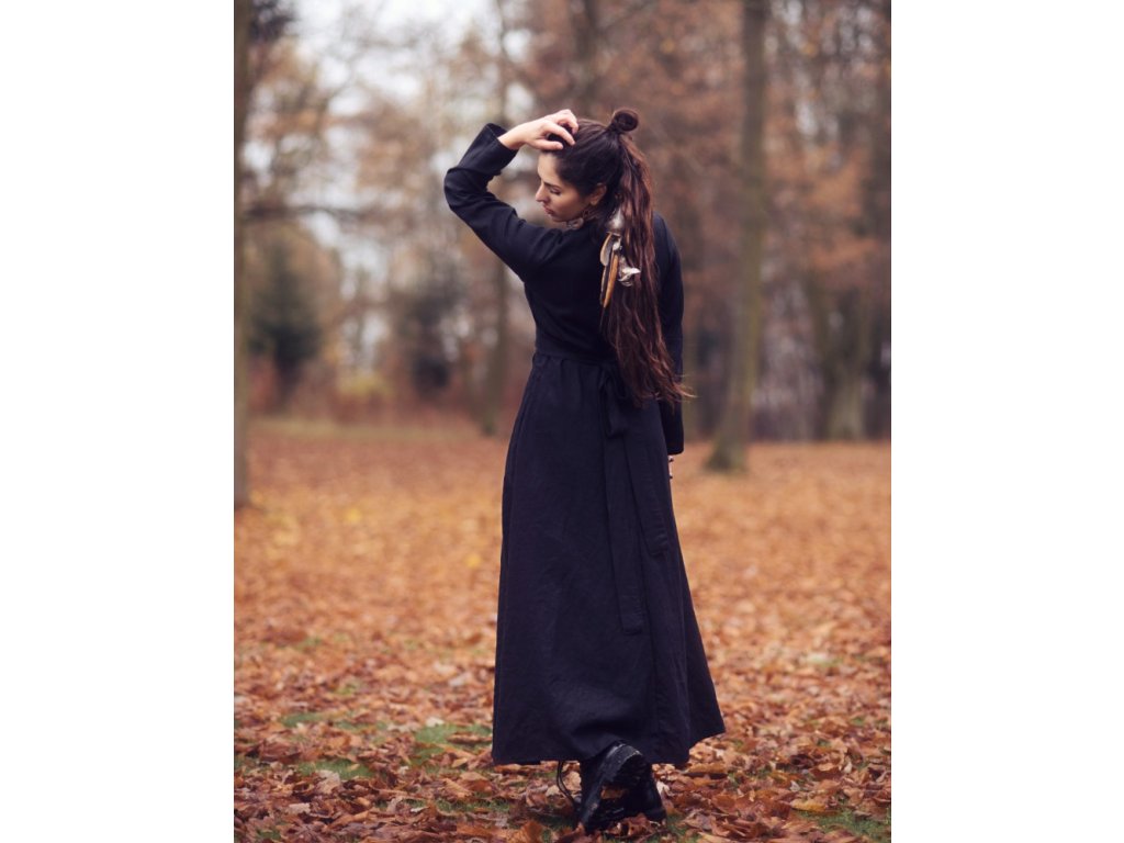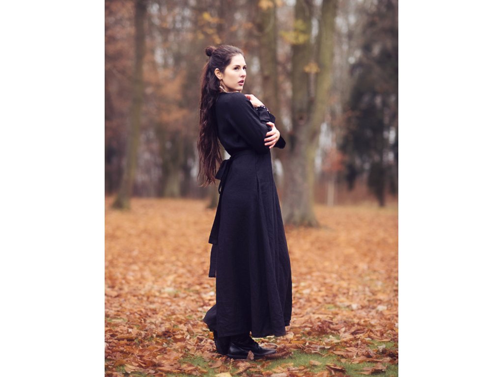 Zavinovací maxi šaty z kvalitního, jemného, lehkého, měkčeného českého lnu v černé barvě.