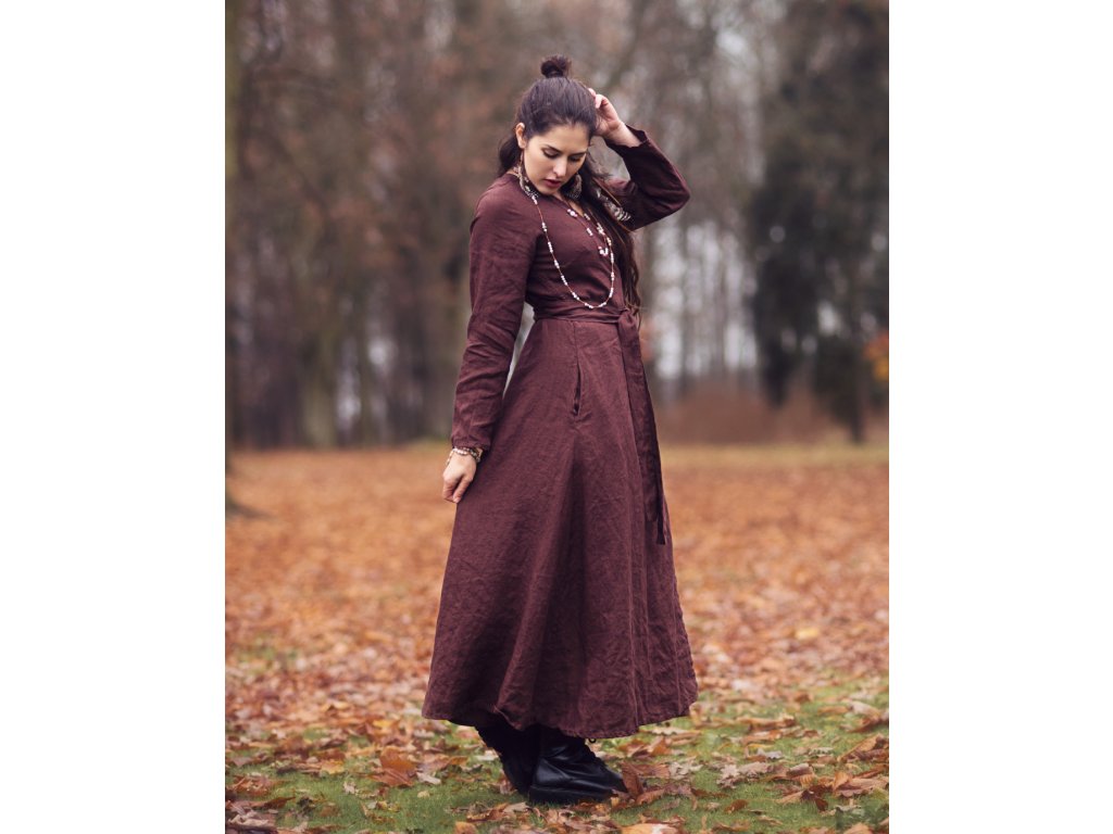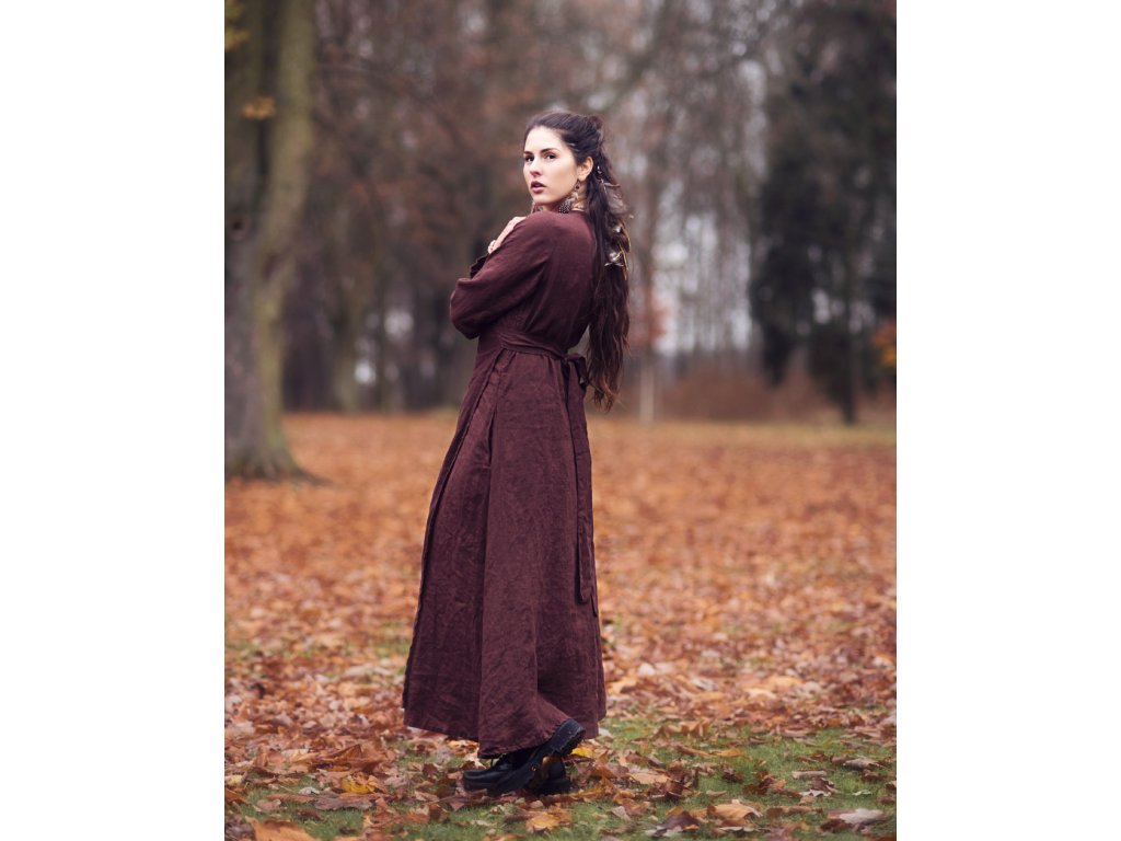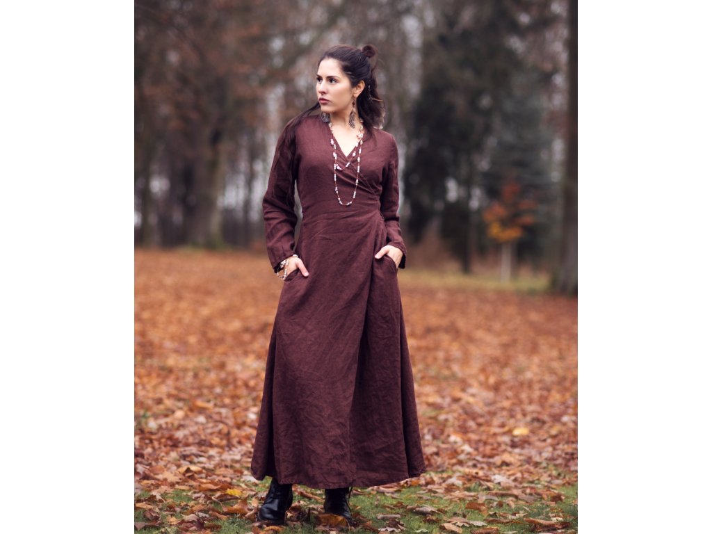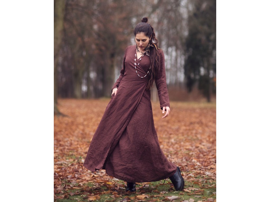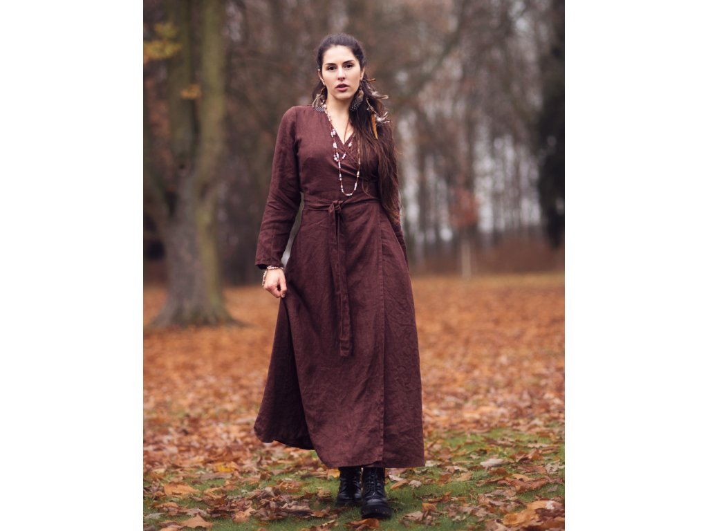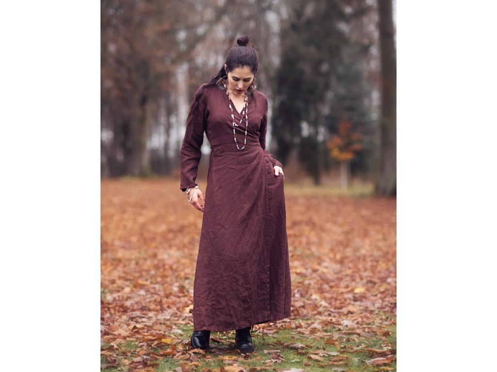 Zavinovací maxi šaty z kvalitního, jemného, lehkého, měkčeného českého lnu v hnědé barvě.