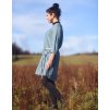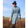 Šaty z krásného měkčeného lnu české výroby. Volnější, lehce projmutý, hladký střih, dole do oblouku, široký dvojitý lem, zadní díl delší, dlouhé rukávy, vnitřní kapsy v bočním švu.