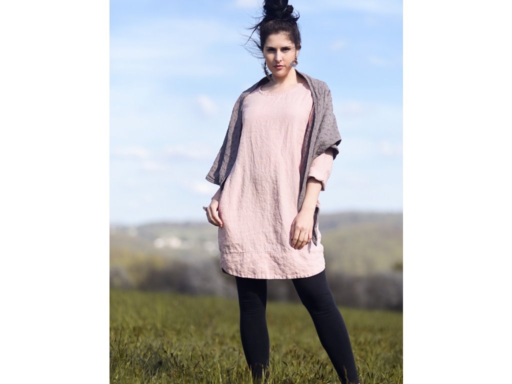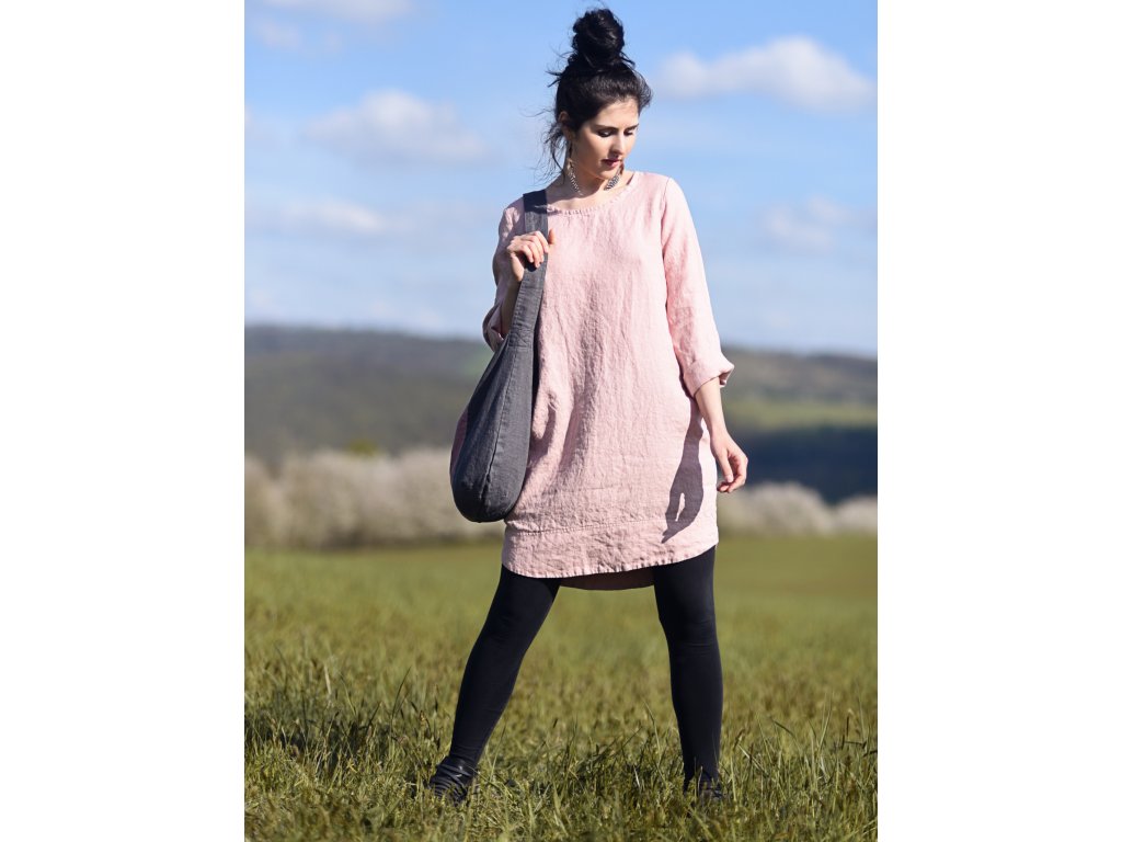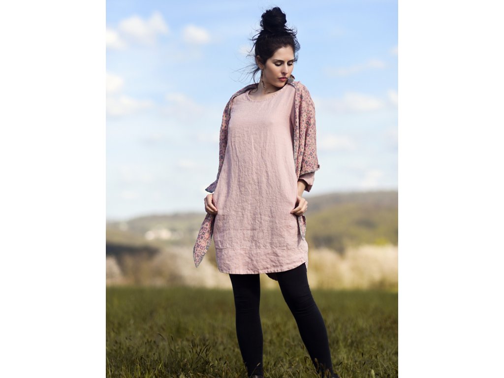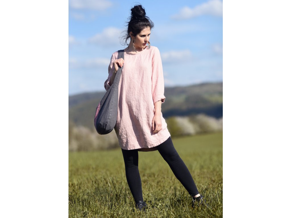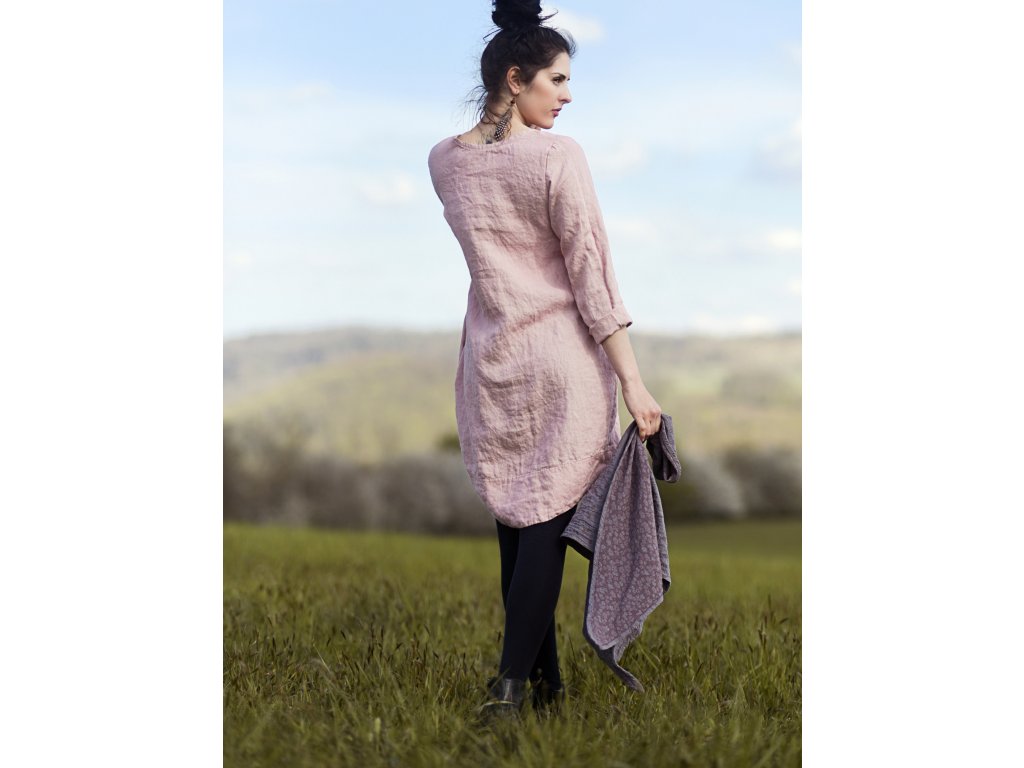Šaty z krásného jemného lnu české výroby. Volnější, lehce projmutý, hladký střih, dole do oblouku, široký dvojitý lem, zadní díl delší, dlouhé rukávy, vnitřní kapsy v bočním švu.