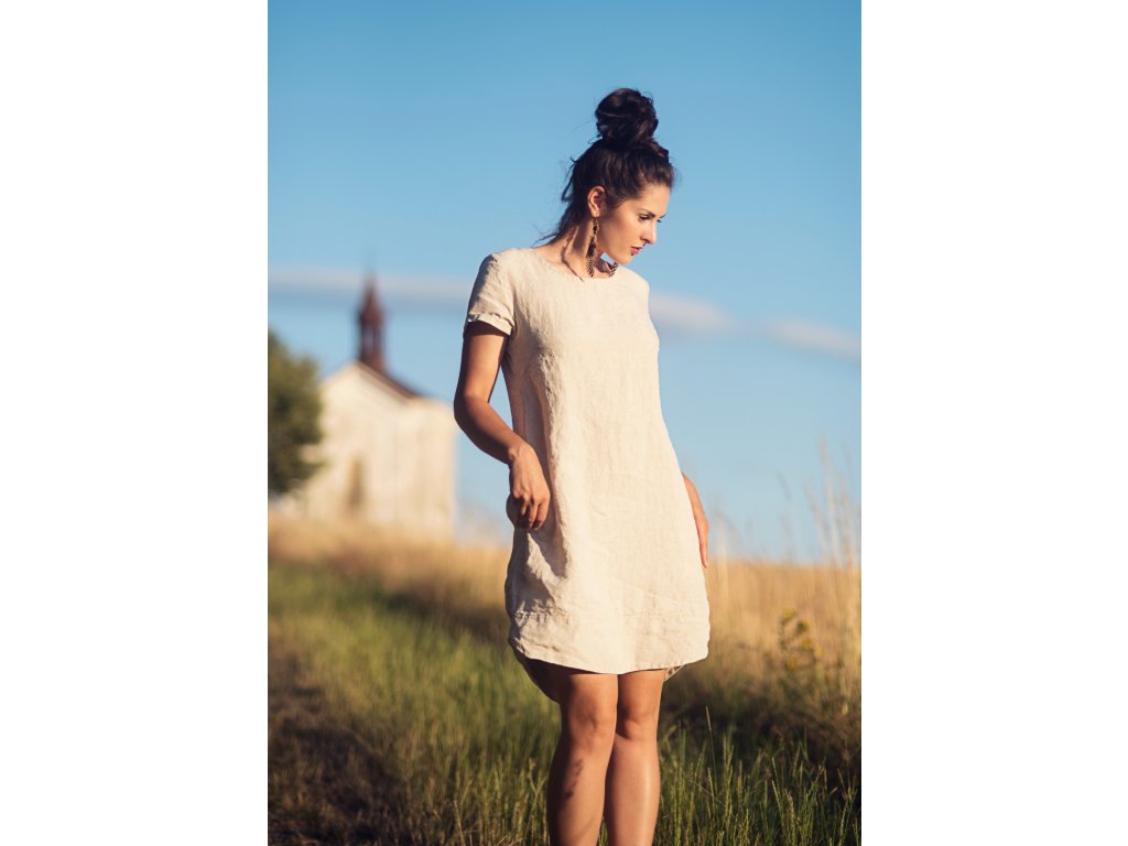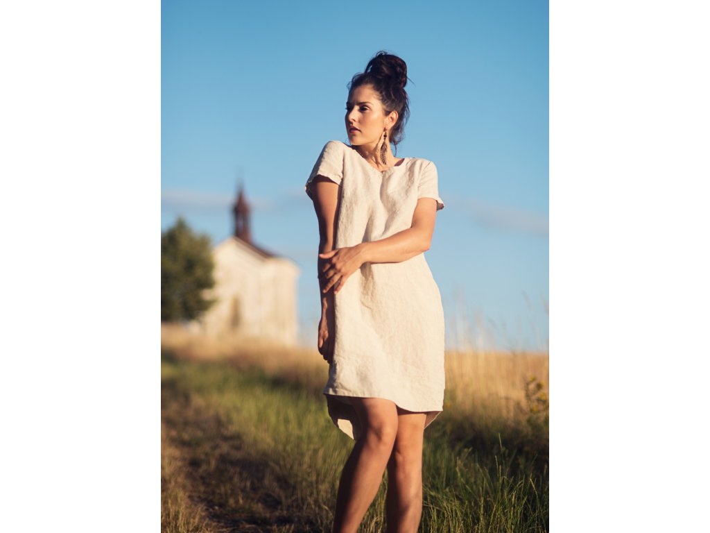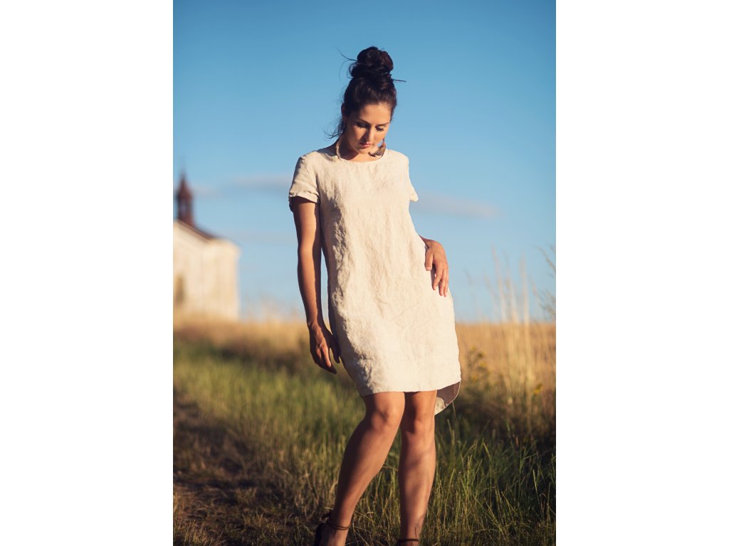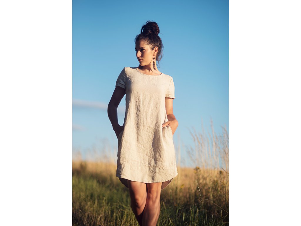 Šaty z krásného lnu české výroby voatmeal režném odstínu. Volnější, lehce projmutý, hladký střih, dole do oblouku, široký dvojitý lem, zadní díl delší, krátké rukávy, vnitřní kapsy v bočním švu.