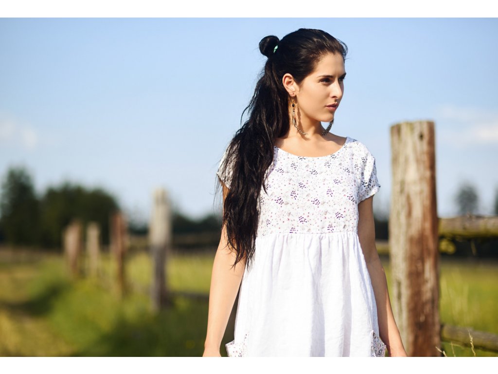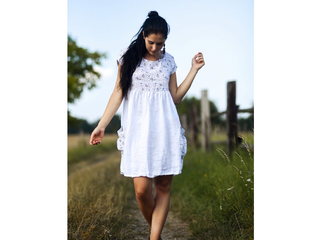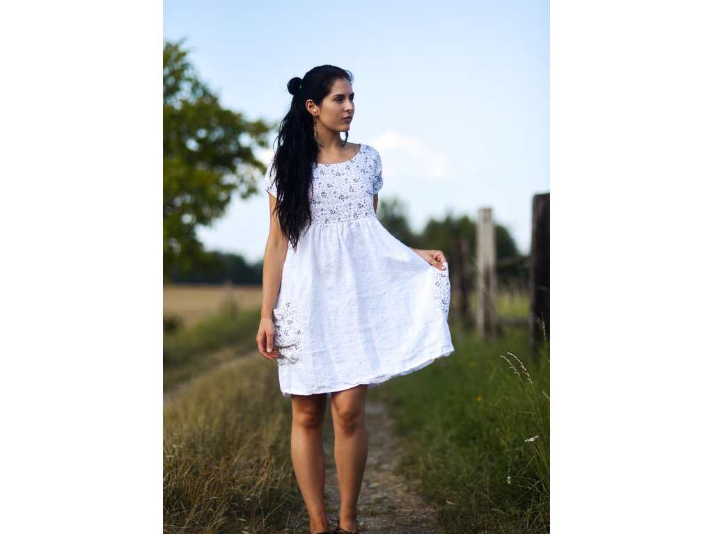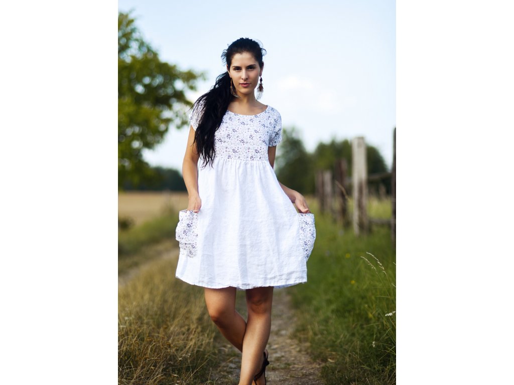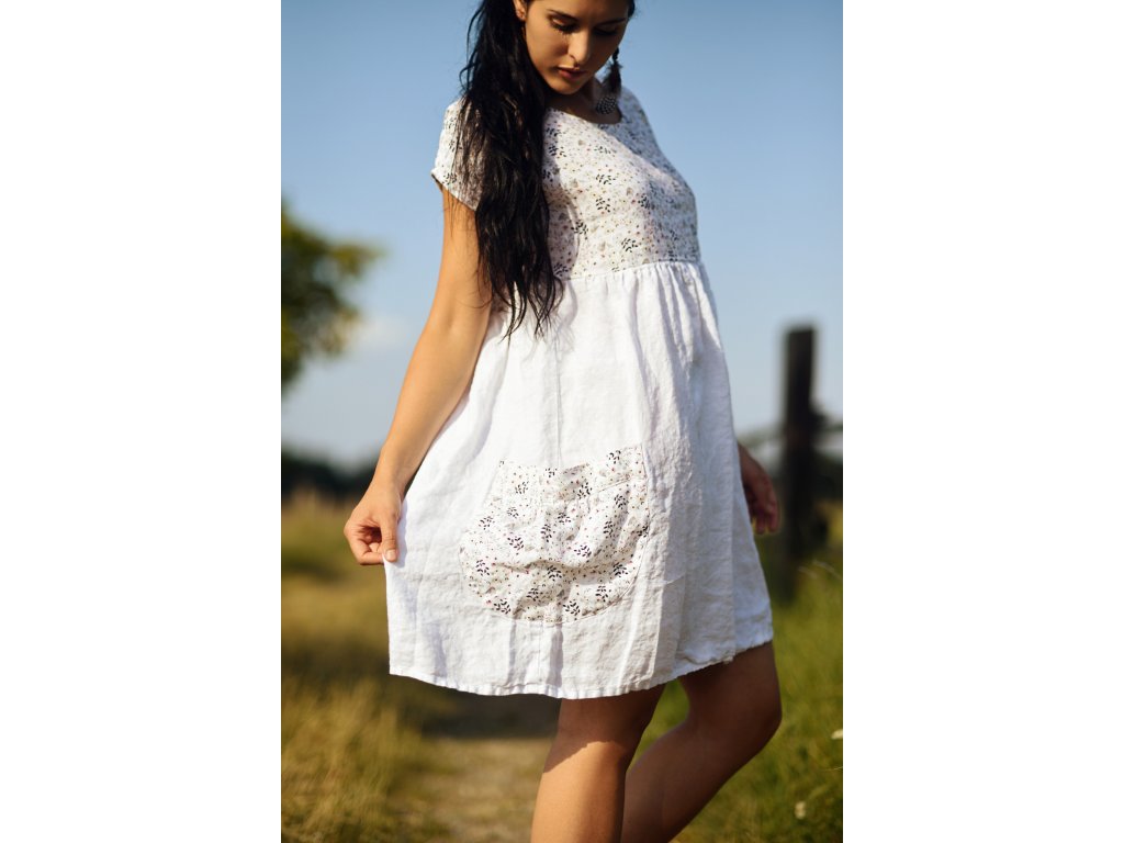 Šaty z kytičkového jemného lnu, s potiskem akvarelových drobných kytek a větviček v pastelových tónech na bílém podkladu. Jemný, lehký, prodyšný. Kombinováno s bílým lnem.