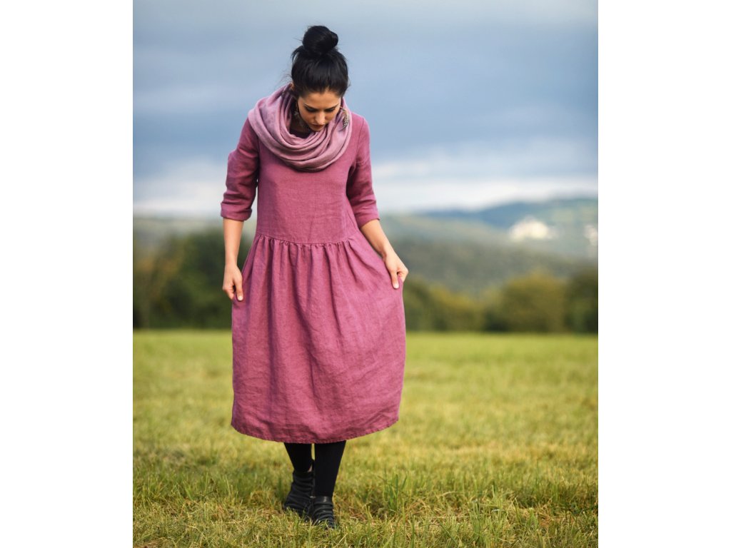 Šaty z krásného jemného lnu české výroby. Volnější střih, nad pasem nabírané, délka midi, tříčtvrteční rukávy, vnitřní kapsy v bočním švu.