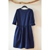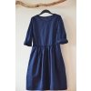 Šaty z dovozového lnu temně modré barvy. Volnější střih, nad pasem nabírané, délka midi, tříčtvrteční rukávy, vnitřní kapsy v bočním švu.