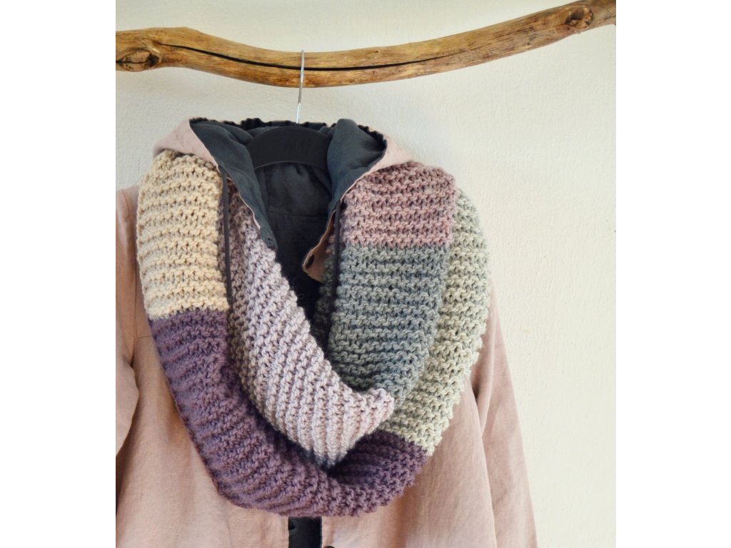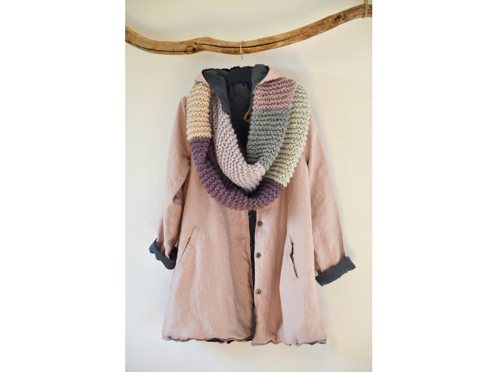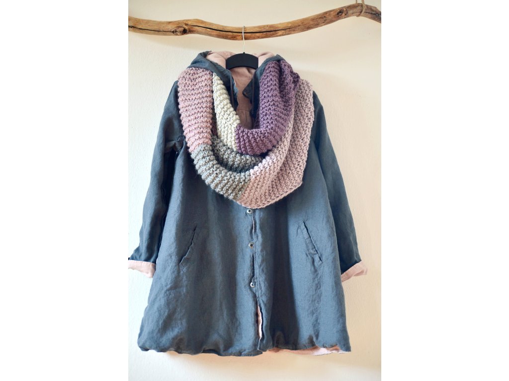 Veliká, silná šála pletená z dovozové příze ve složení vlna alpaka... nepravidelné barevné pruhy jemných pastelových tónů - pudrově růžová, šedorůžová, béžová, starofialová, šedá, stříbrošedá.