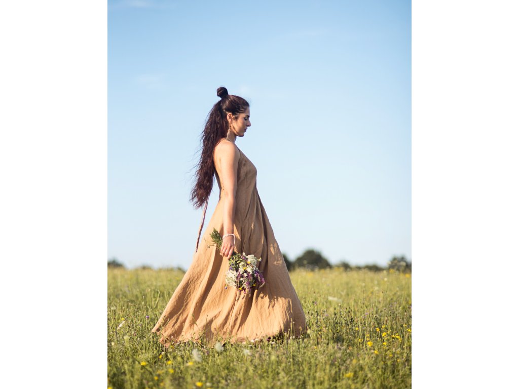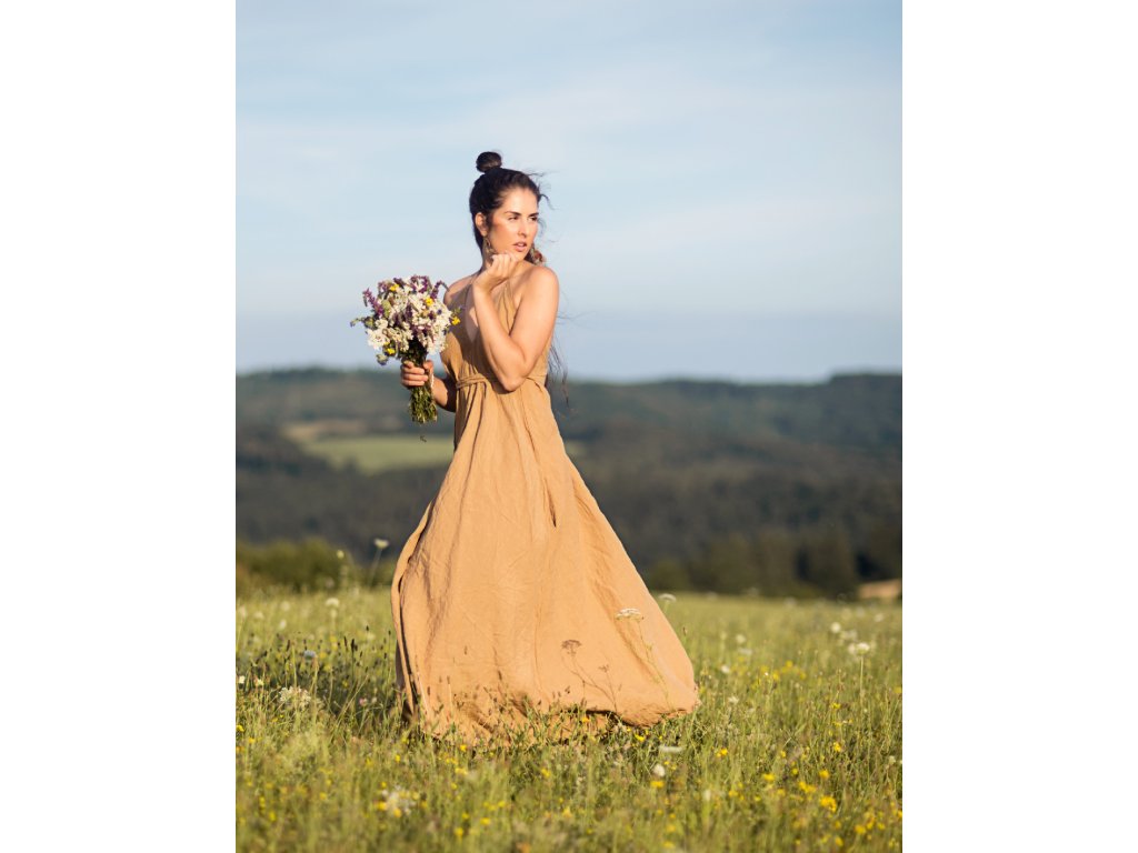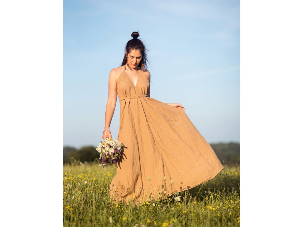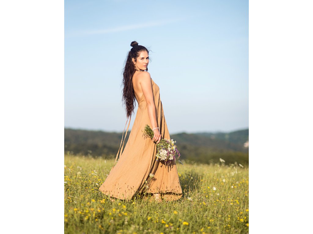 Maxišaty z kvalitního, jemného, českého lnu autorské medové barvy - střih s odhalenými zády, dlouhá šňůrka pro několik způsobů uvázání, vnitřní kapsy v bočním švu.