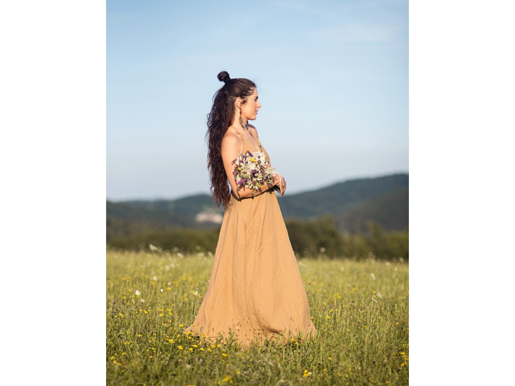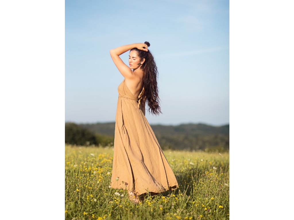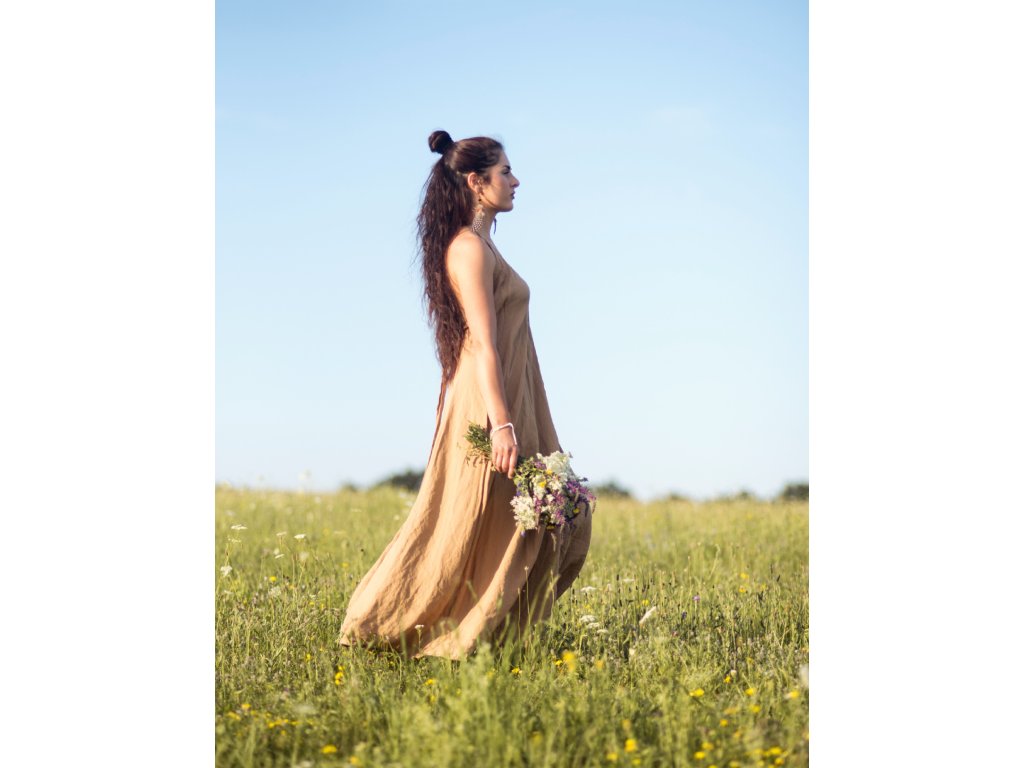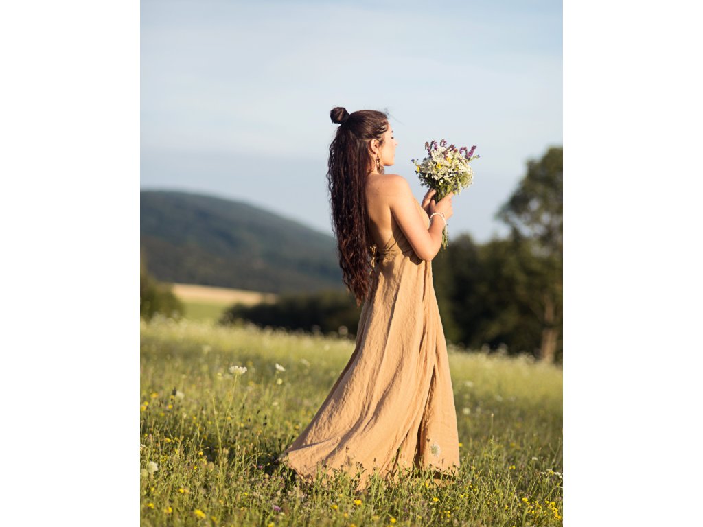 Maxišaty z kvalitního, jemného, českého lnu autorské medové barvy - střih s odhalenými zády, dlouhá šňůrka pro několik způsobů uvázání, vnitřní kapsy v bočním švu.