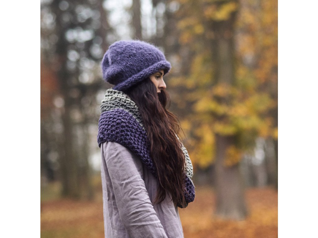 Velikánský nákrčník háčkovaný z luxusní dovozové příze..100% alpaky. Můžete jej nosit nadvakrát omotaný kolem krku, přehozený přes ramena nebo přes hlavu. Fialová, tmavší a světle šedá