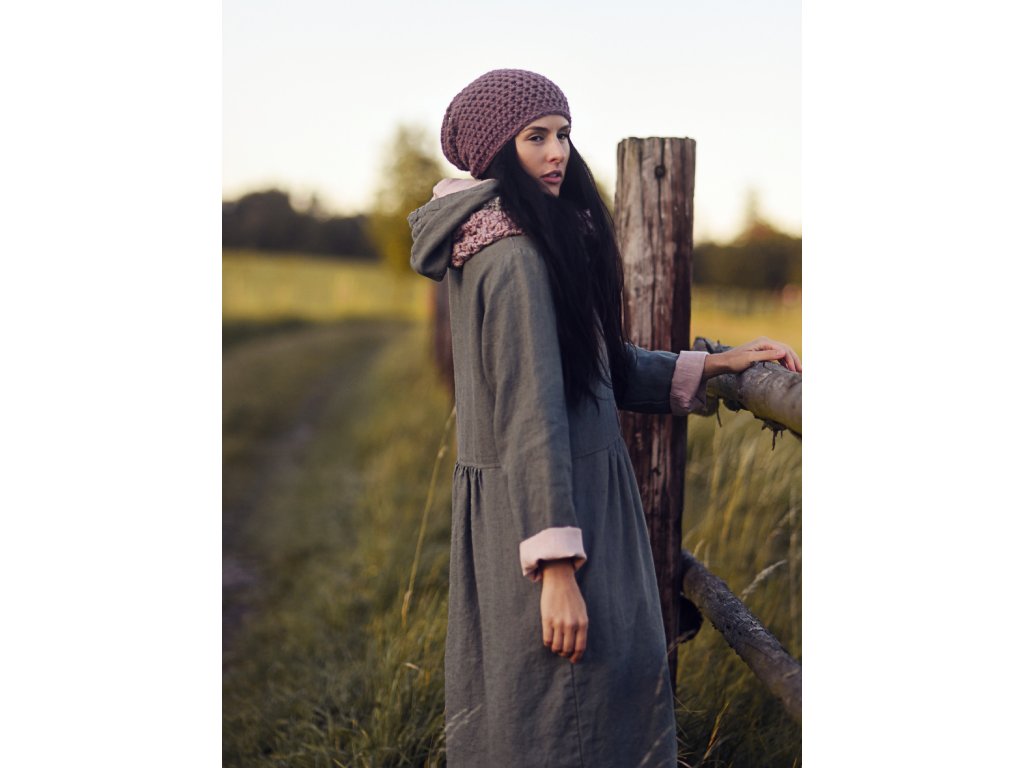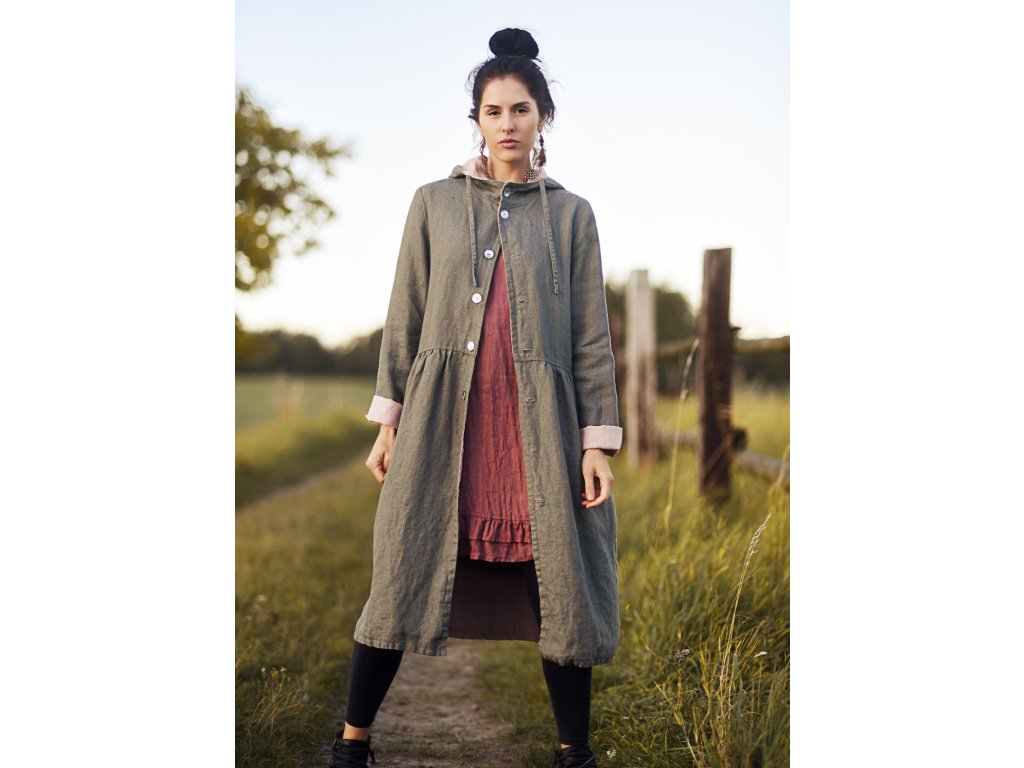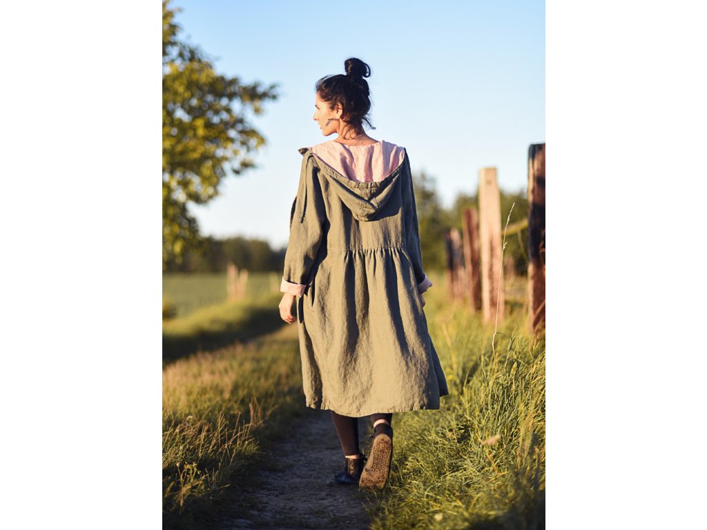 Luxusní oboustranný kabát s kapucí z velmi kvalitního českého lnu, pudrově růžový a khaki.