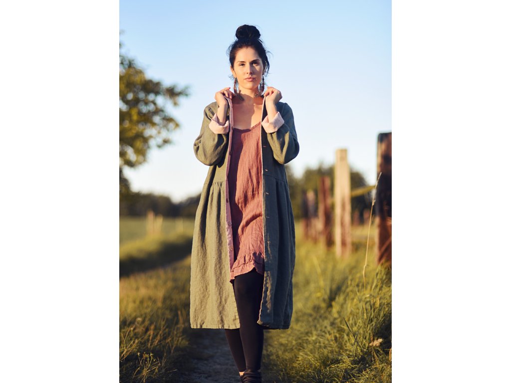 Lněný oboustranný kabát khaki / pudrová