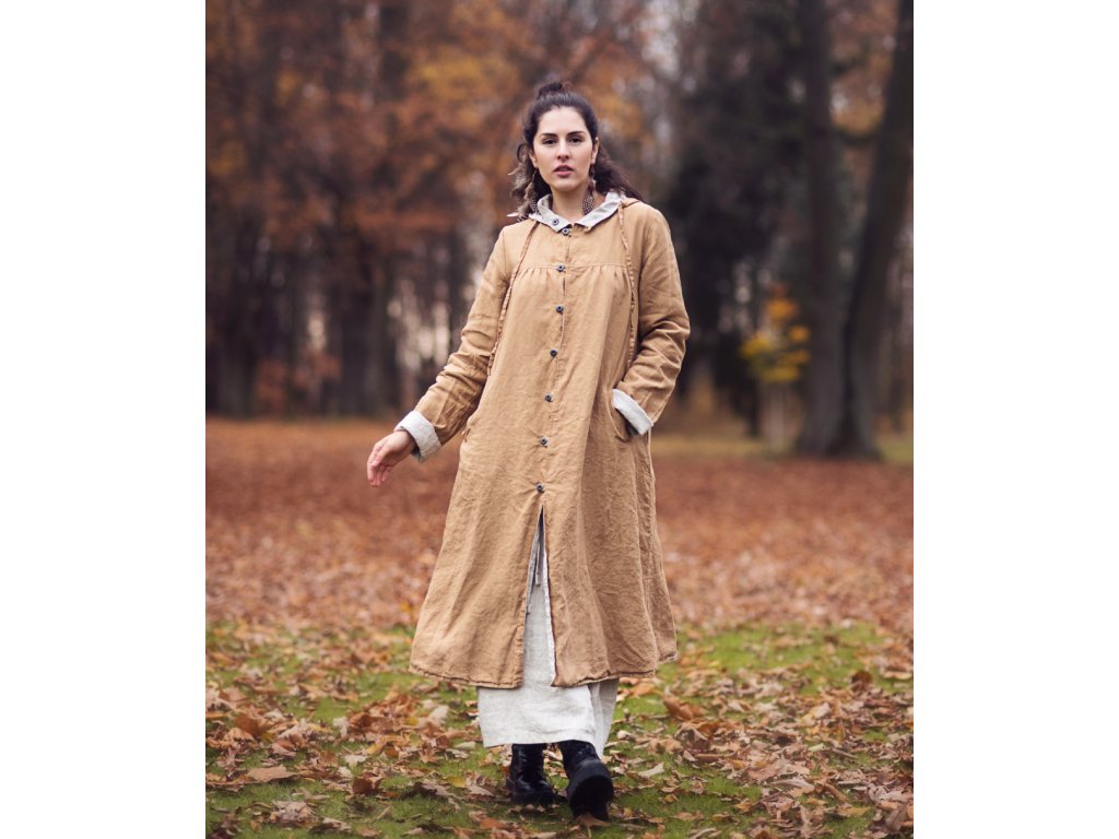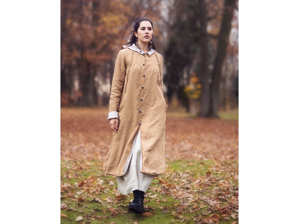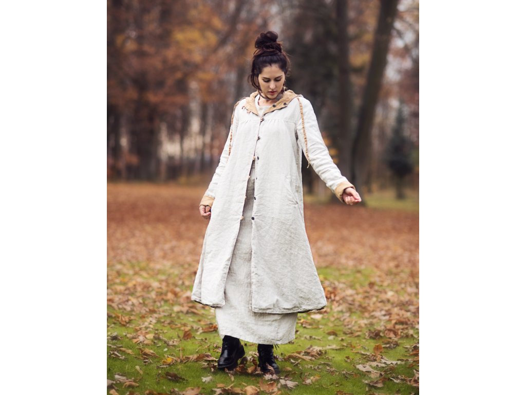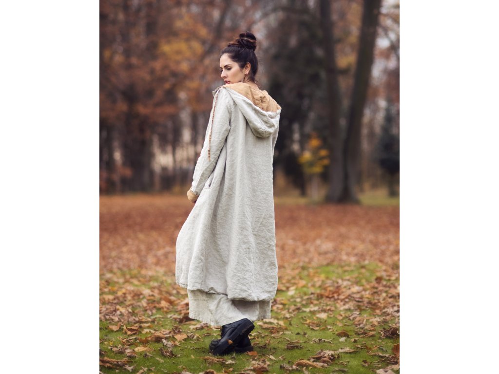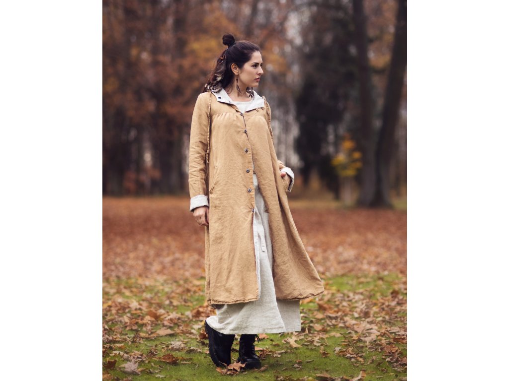 Luxusní oboustranný kabát s kapucí z velmi kvalitního českého lnu, režné a autorské medové barvy. Volný, áčkový střih, vnitřní kapsy z obou stran, zapínání na kovové knoflíčky, prostorná kapuce.