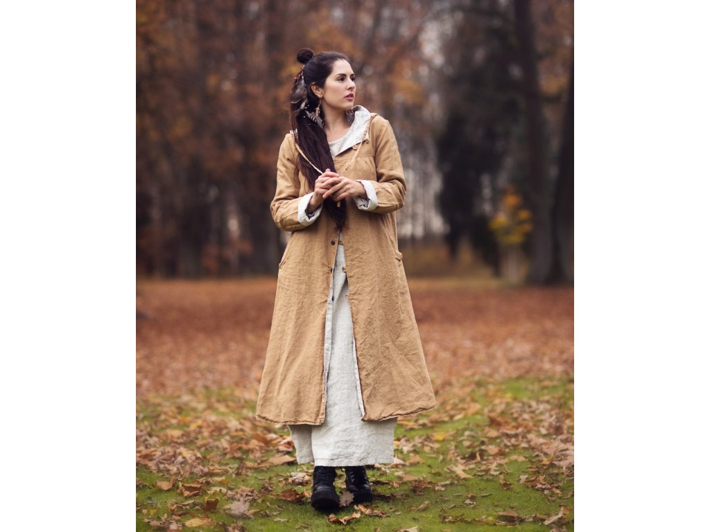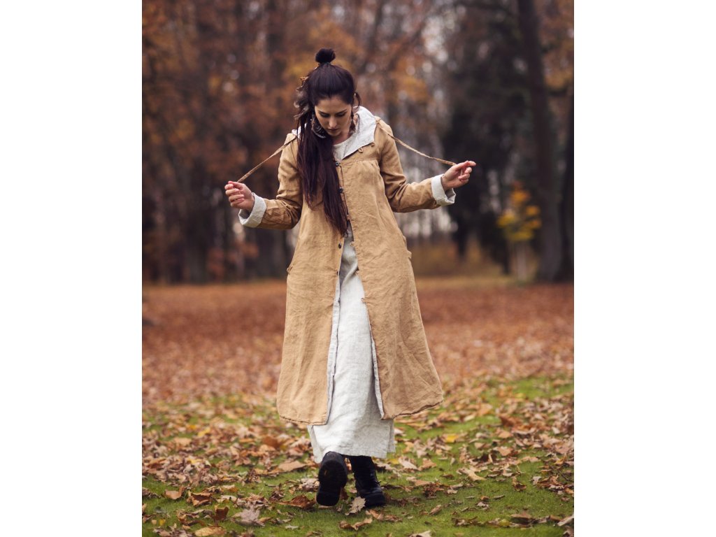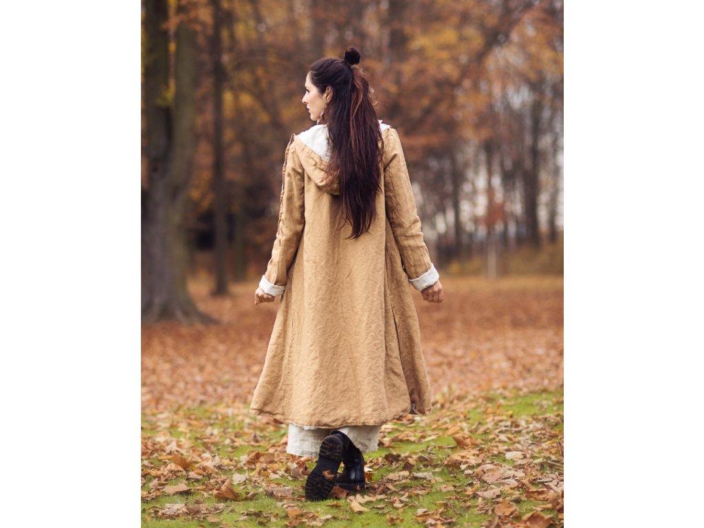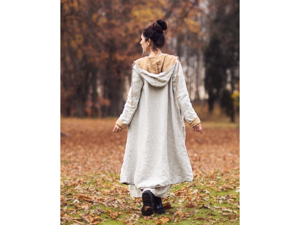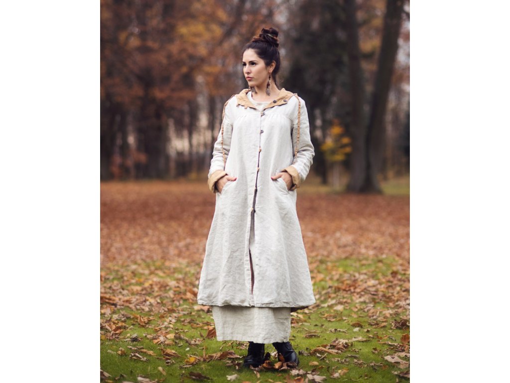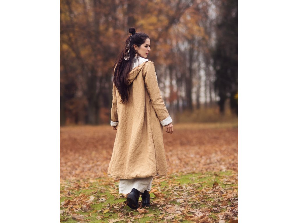 Luxusní oboustranný kabát s kapucí z velmi kvalitního českého lnu, režné a autorské medové barvy. Volný, áčkový střih, vnitřní kapsy z obou stran, zapínání na kovové knoflíčky, prostorná kapuce.