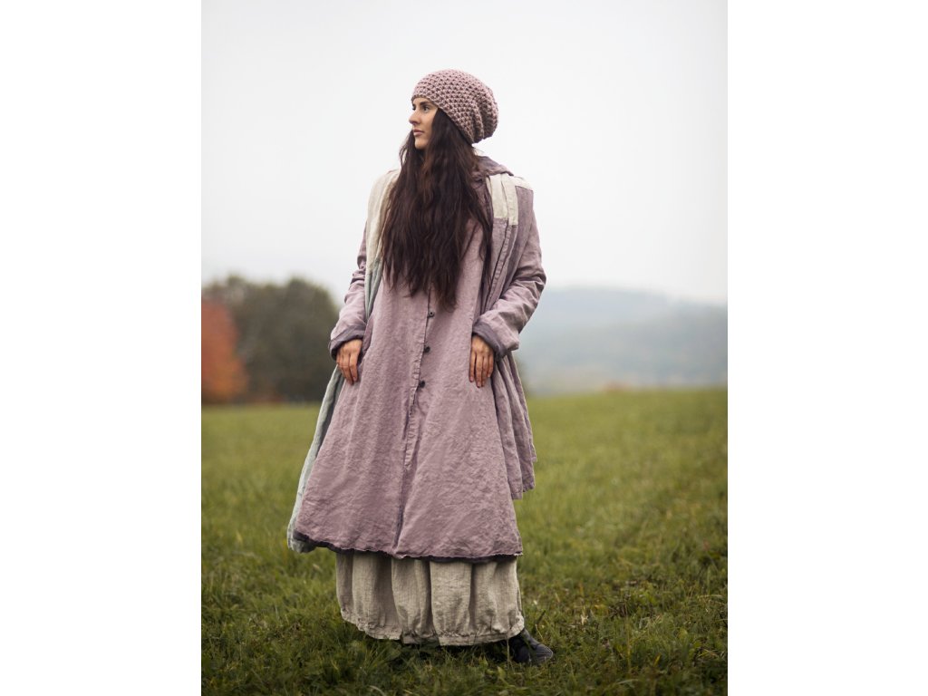 Luxusní oboustranný kabát s kapucí z velmi kvalitního českého lnu, autorské světle a tmavě šedofialové barvy. Volný, áčkový střih, vnitřní kapsy z obou stran, zapínání na kovové knoflíčky, prostorná kapuce.