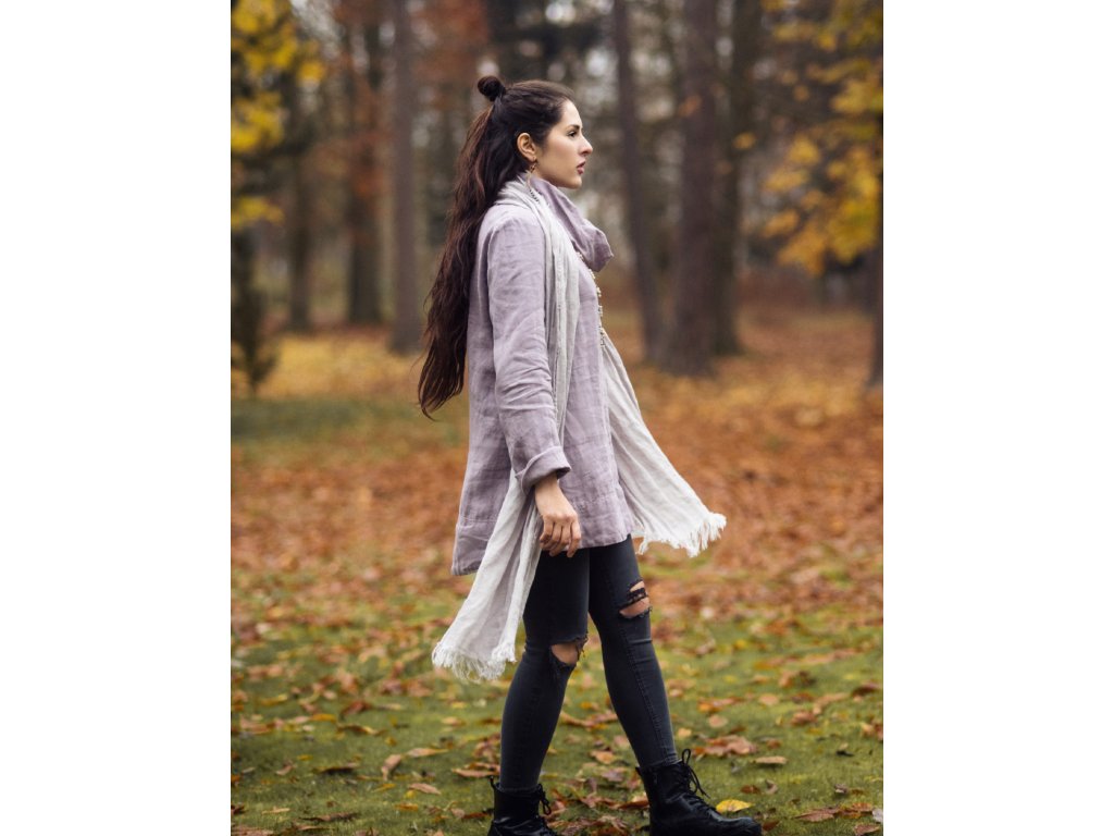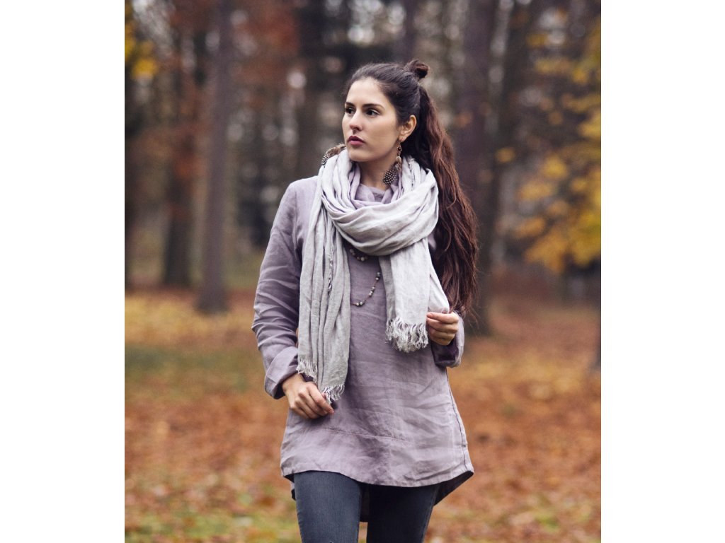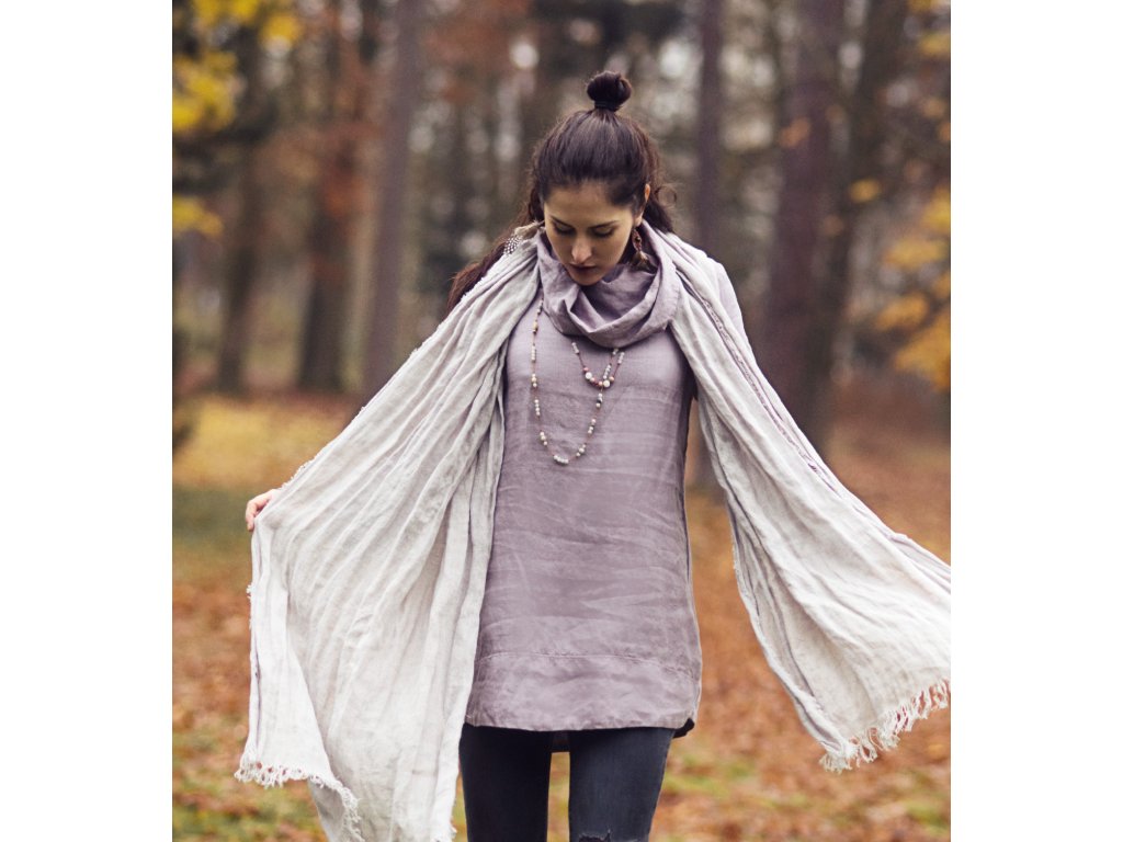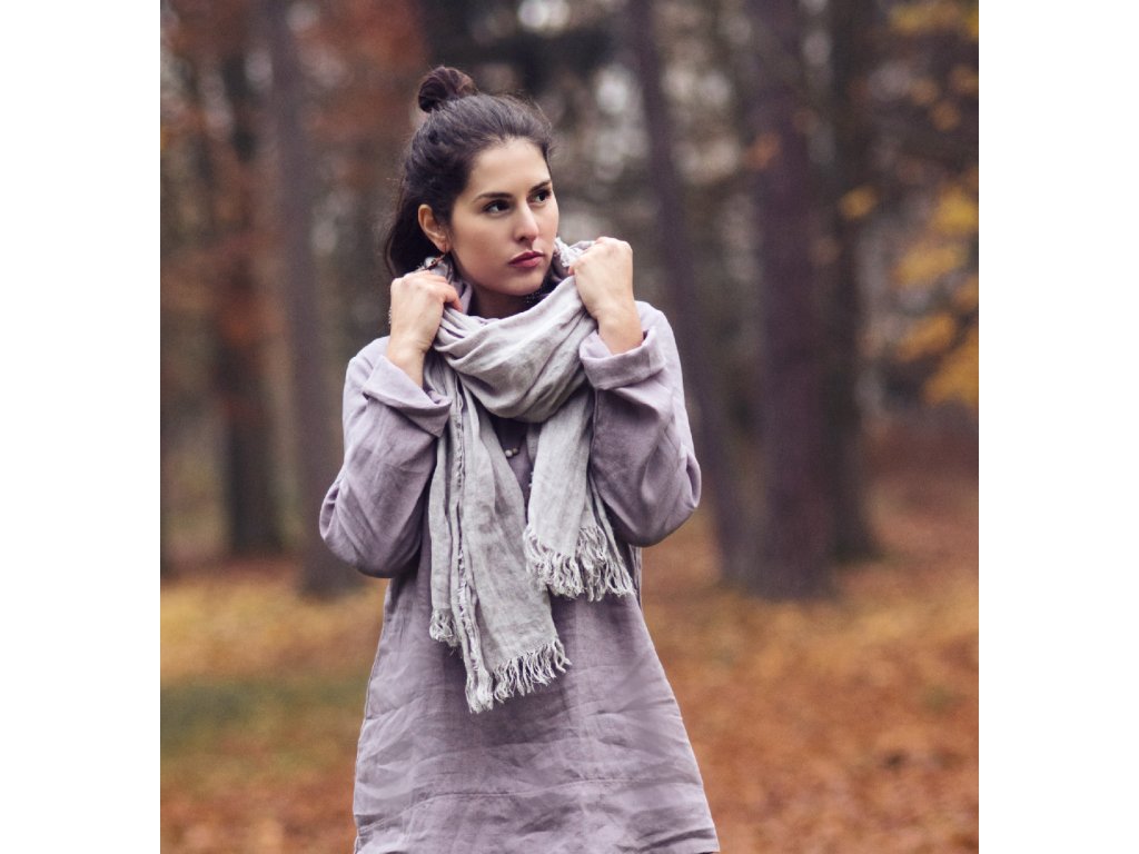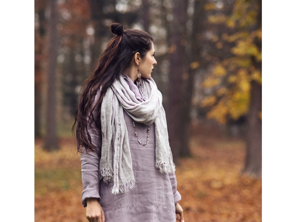 Lehký šál z velmi kvalitního, lehkého, řídce tkaného, průhledného lnu ve světle šedé.