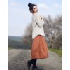 Midi sukně z kvalitního jemného českého lnu ..ze čtyř dílů, švy prošity, vnitřní kapsy v bočních švech, spodní část tvarovaná výraznými záševky, v pase šedý pružný lem bavlna/elastan. Ve spodním lemu bavlněná šňůrka pro případné stažení.
