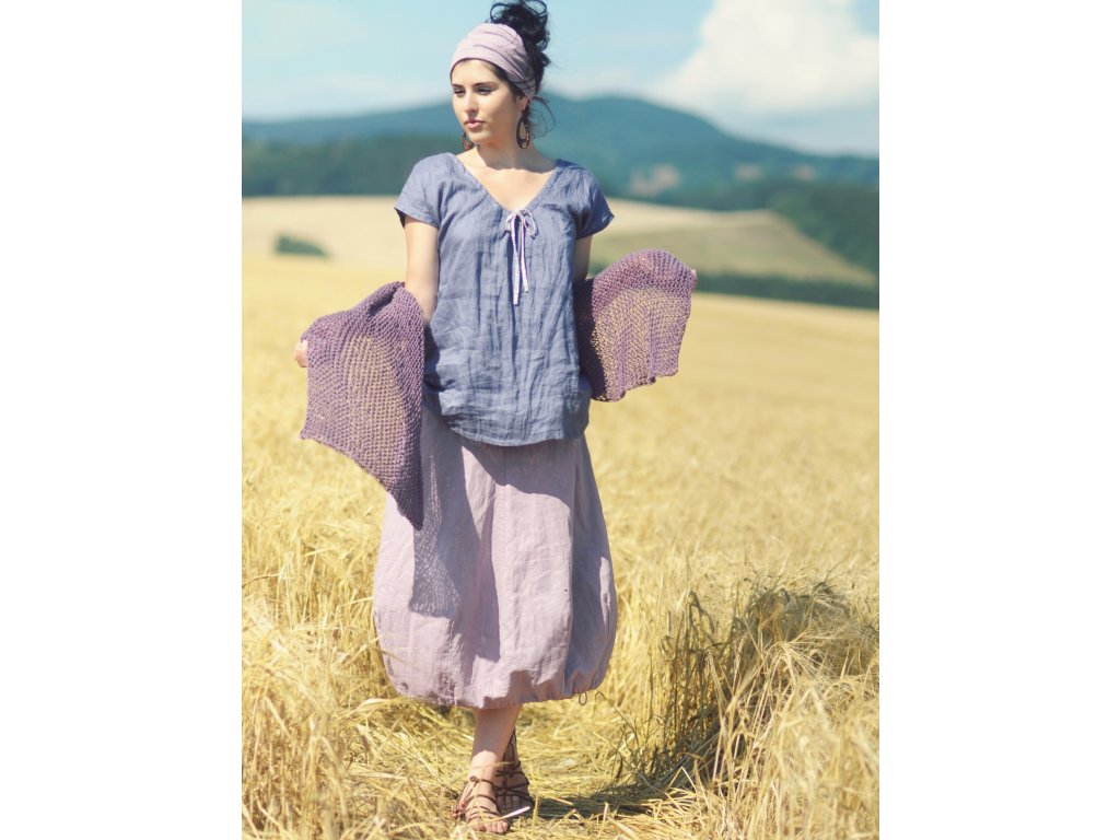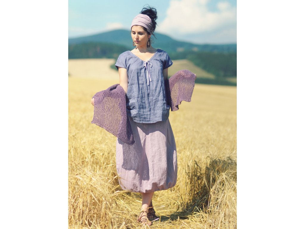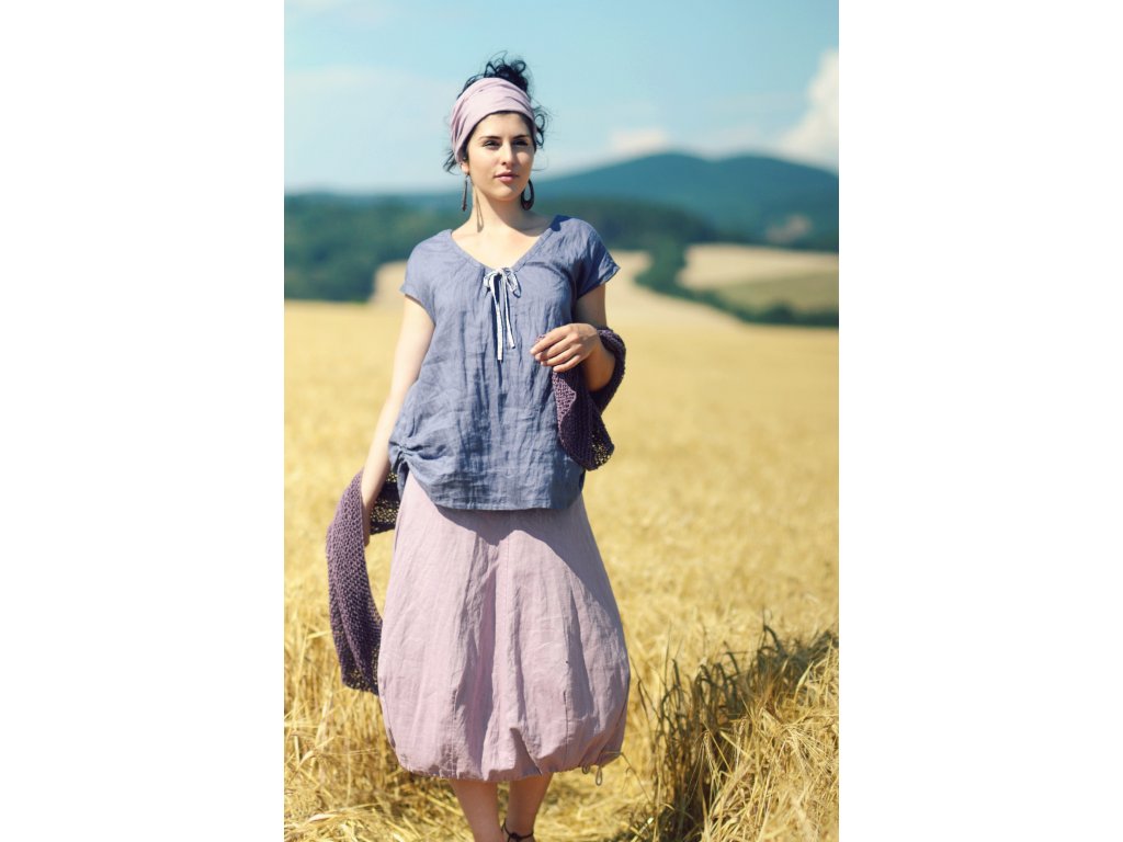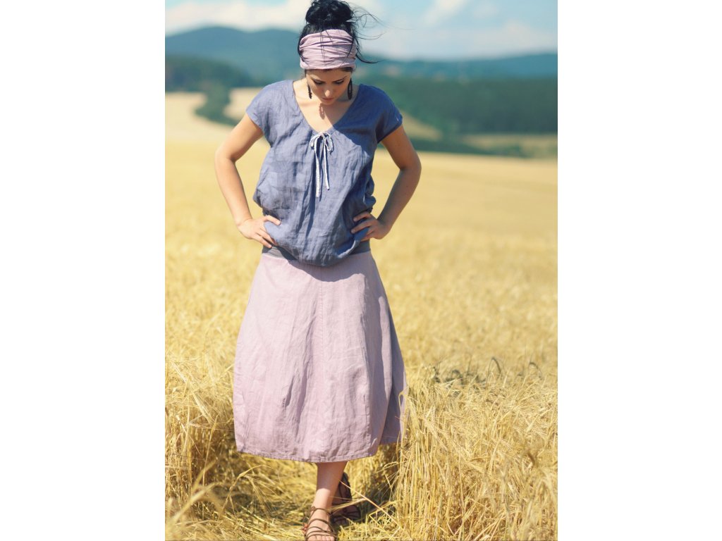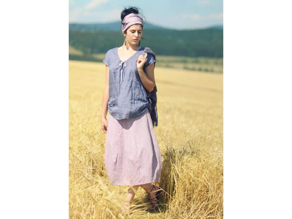 Lněná midi sukně... ze čtyř dílů, švy prošity, vnitřní kapsy v bočních švech, spodní část tvarovaná výraznými záševky, v pase šedý pružný lem bavlna/elastan. Ve spodním lemu bavlněná šňůrka pro případné stažení.