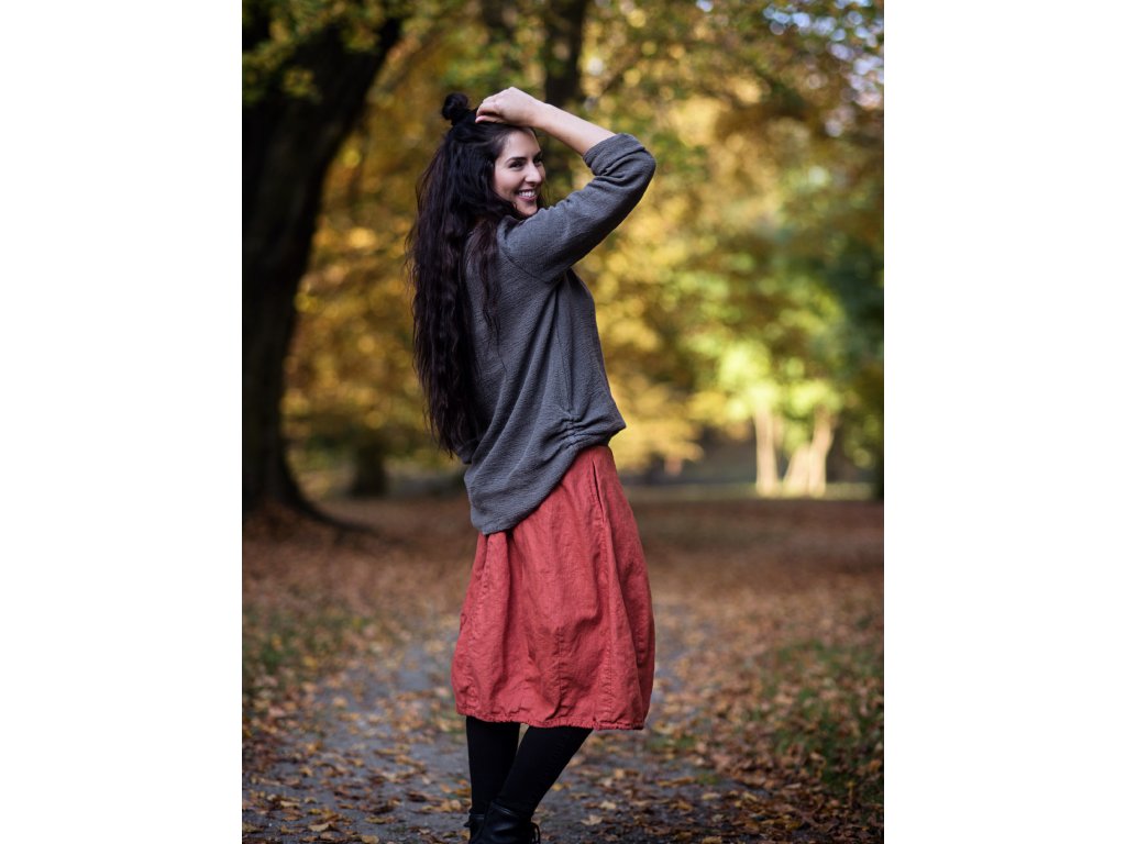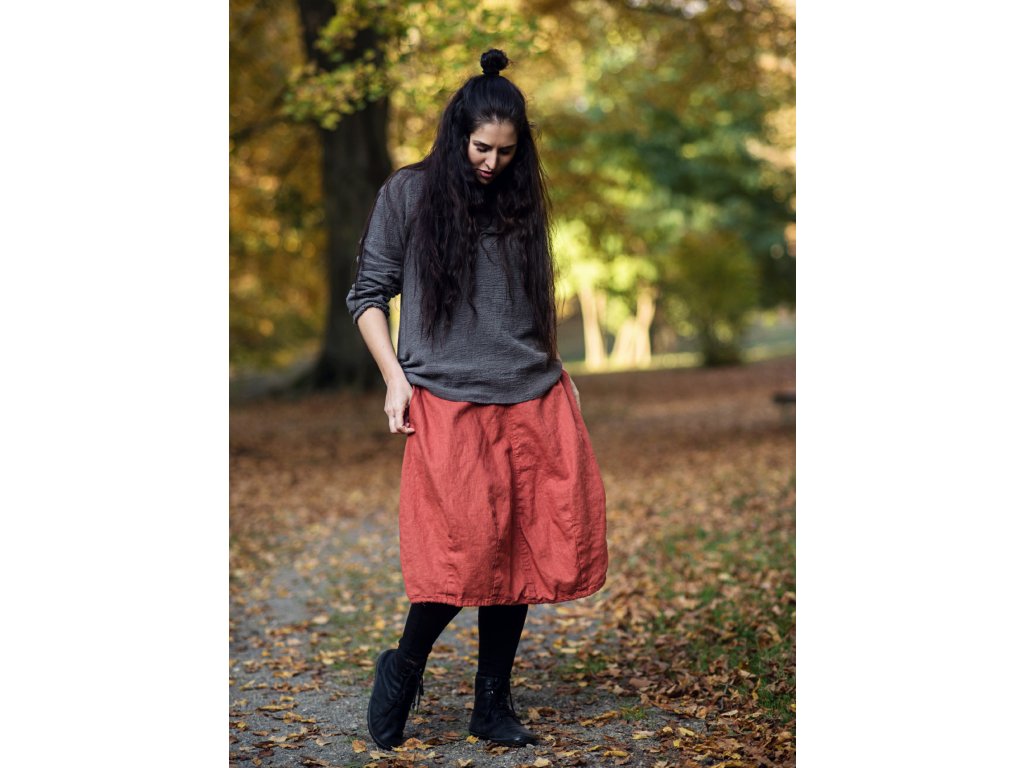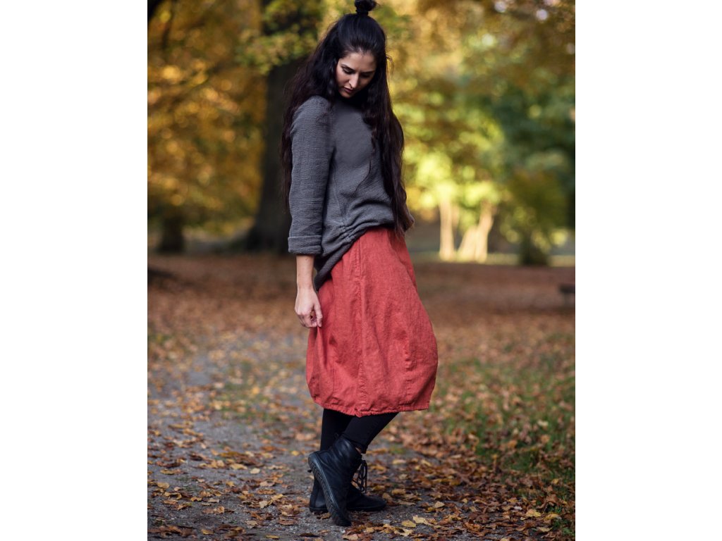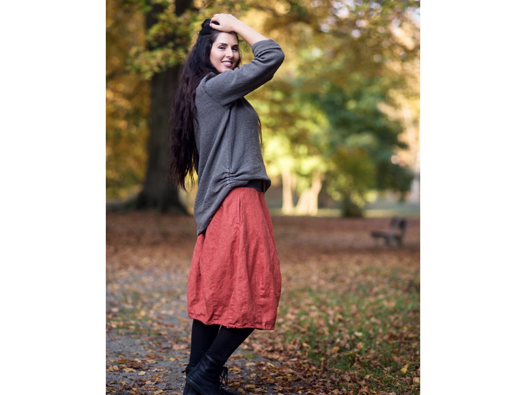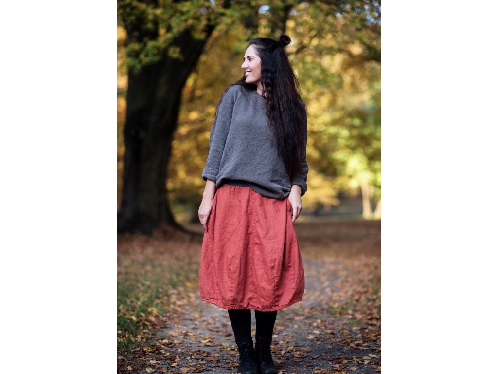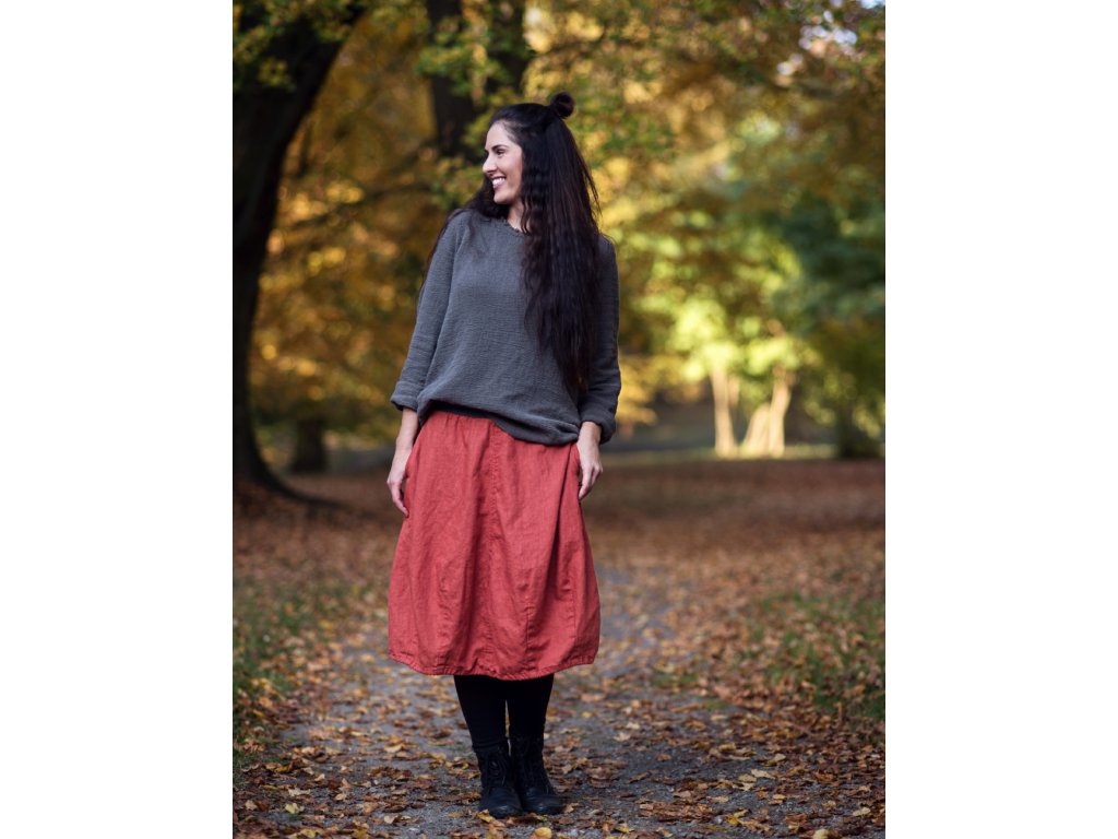 Lněná midi sukně... ze čtyř dílů, švy prošity, vnitřní kapsy v bočních švech, spodní část tvarovaná výraznými záševky, v pase šedý pružný lem bavlna/elastan. Ve spodním lemu šedá bavlněná šňůrka pro případné stažení.