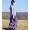 Luxusní maxi sukně z českého, jemného, splývavého lnu švestkové barvy. Sukně je široká, v pase / sníženém pase dvě řady gumiček v tunýlku a asymetricky na straně tkanička ze stejného materiálu na stažení.. Kapsy ve švech.
